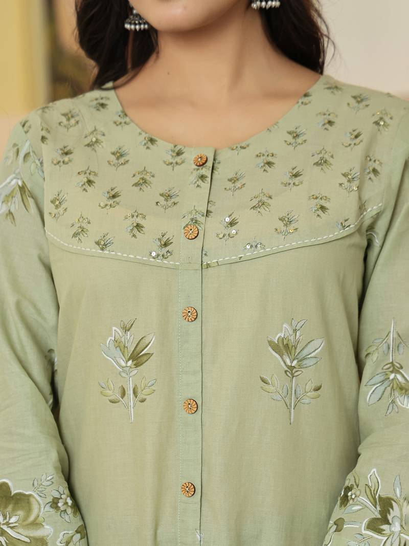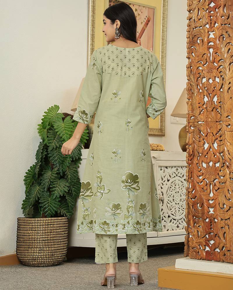 Yufta green floral print pure cotton kantha work a-line kurta trouser dupatta set
