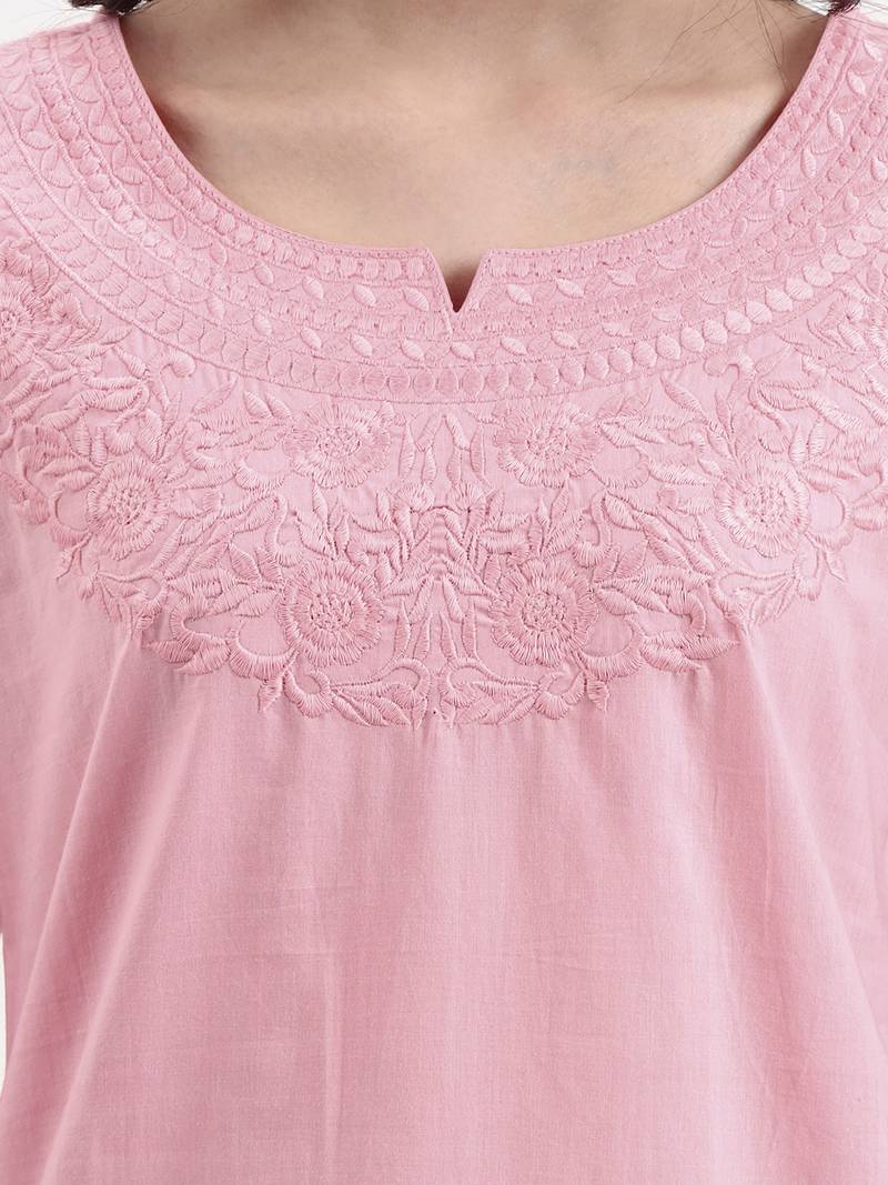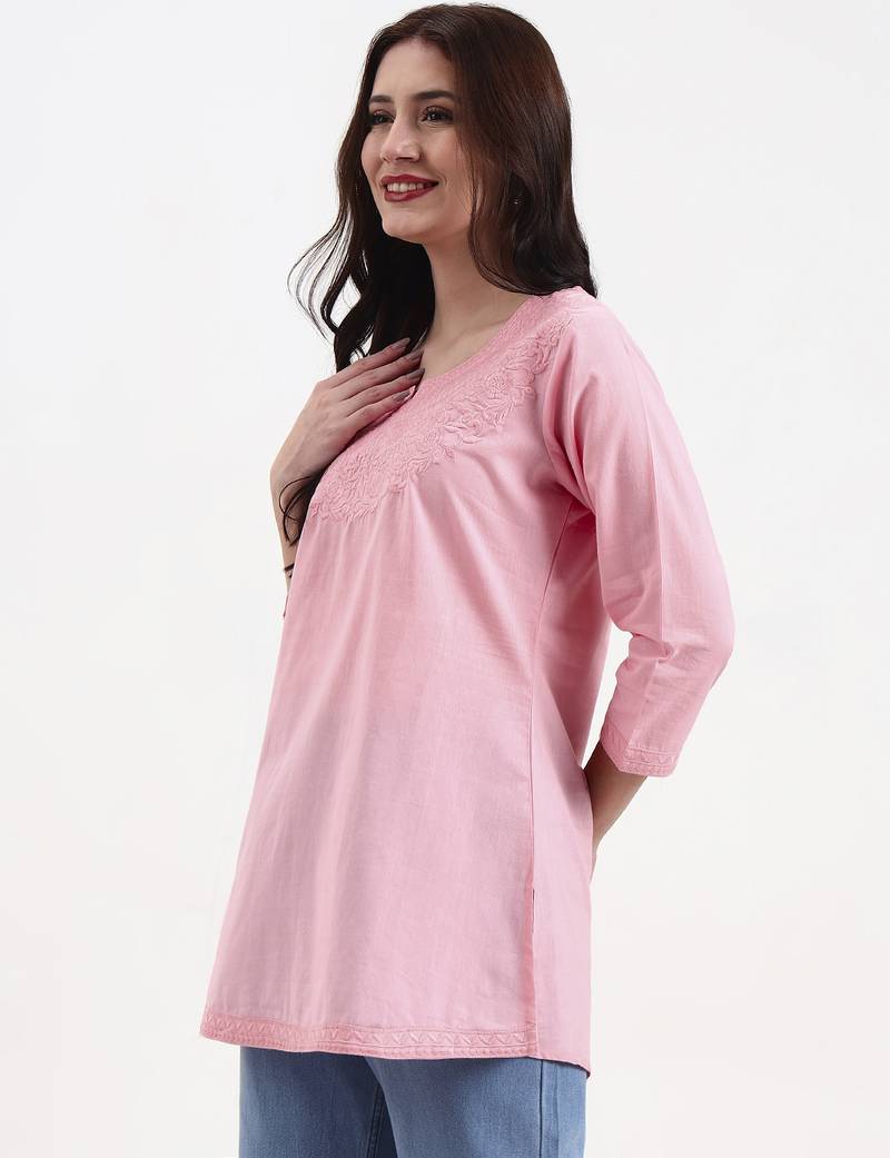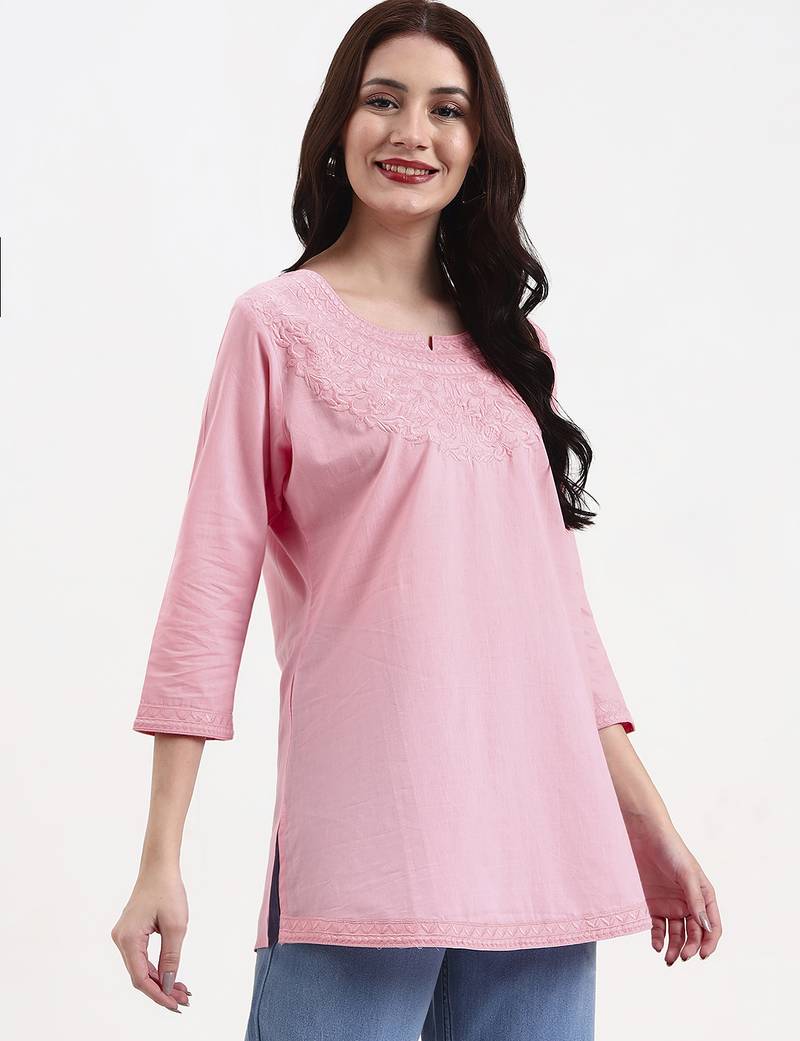 Product Description | Pink Resham Embroidery Cotton Straight Peplum Top Design Resham Embroidery Peplum Shape Three Quarter Sleeve Round Neck Hip Length Top Straight Him Machine Weave Cotton Full On Waist Size & Fit Material & Care Cotton Hand Wash |