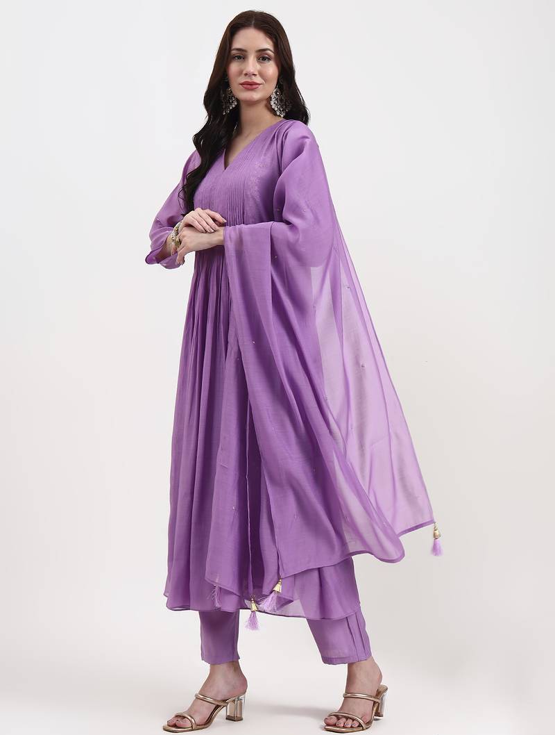Product Description | Purple Solid Chanderi Silk A Line Kurta Trouser Dupatta Set Kurta Design Sequins Work Handwork A Line Shape Have A Lining, Three Quarter Sleeve V Neck Calf Length Kurta Flared Him Machine Weave Chanderi Silk Trouser Design: Purple Silk Blend Trouser Slip On Waist Size & Fit Material & Care Chanderi Silk |