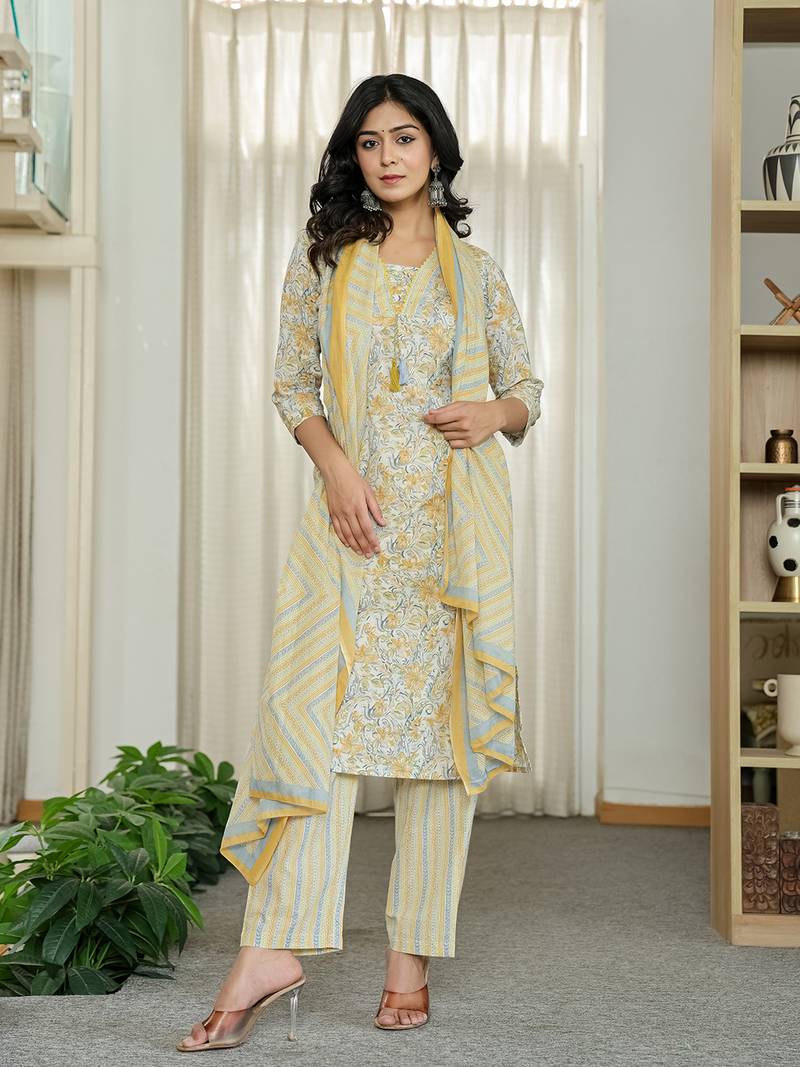 | Product Name | Yellow Pure Cotton Floral Print Kurta Dupatta Pant Set | |