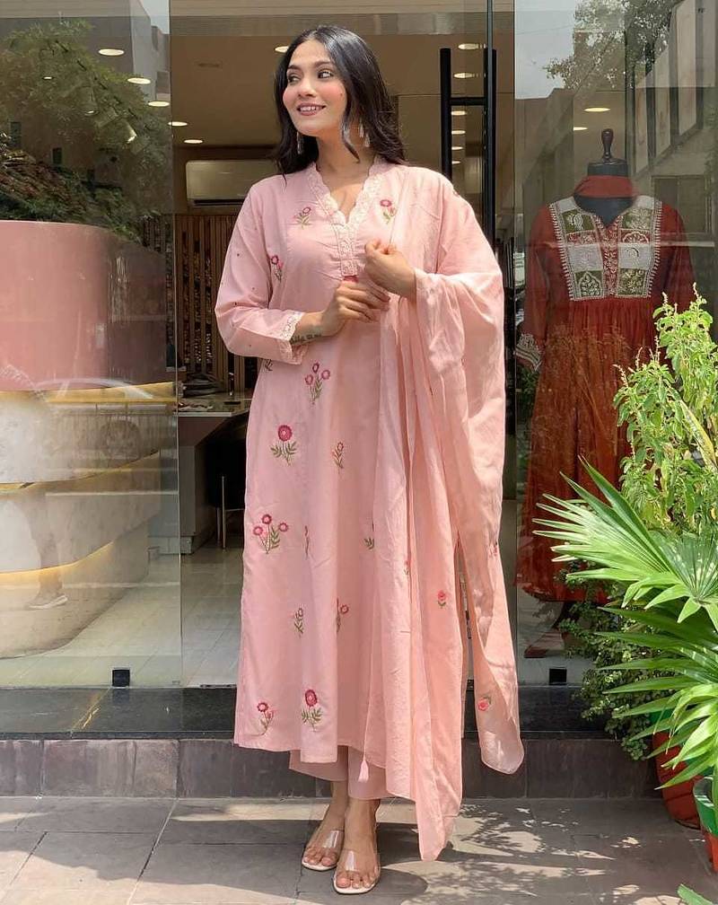 Aaysa women pure cotton embroidered pink kurta with pant and dupatta