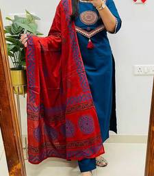 Women pure cotton embroidery blue kurta with pant and dupatta