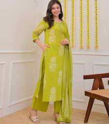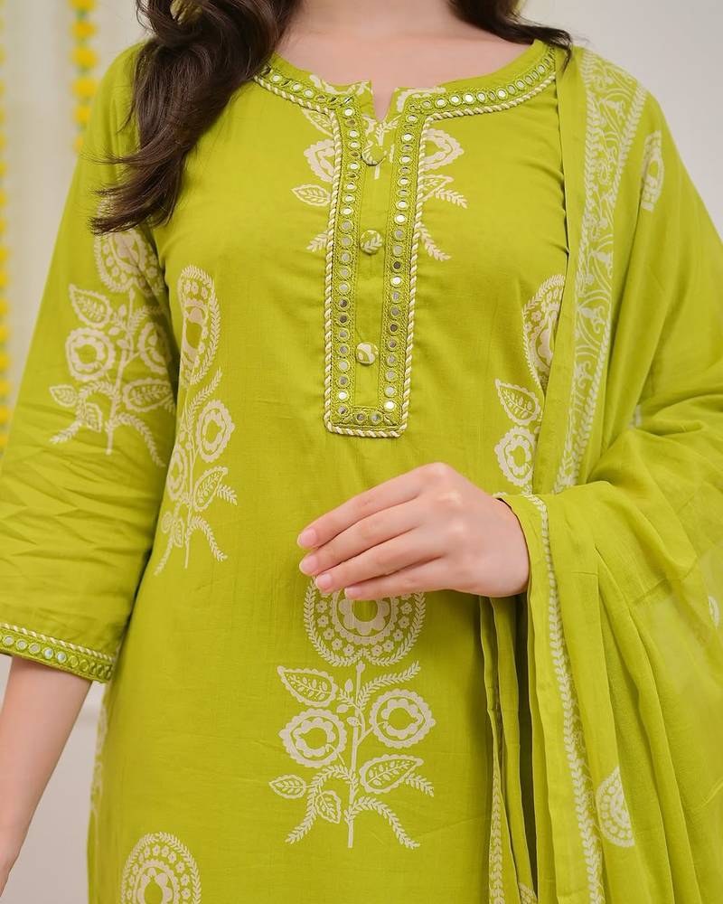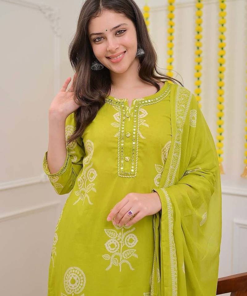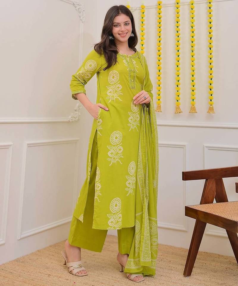 Product Name | Women Pure Cotton Printed Green Kurta With Pant And Dupatta | |