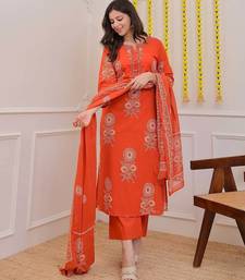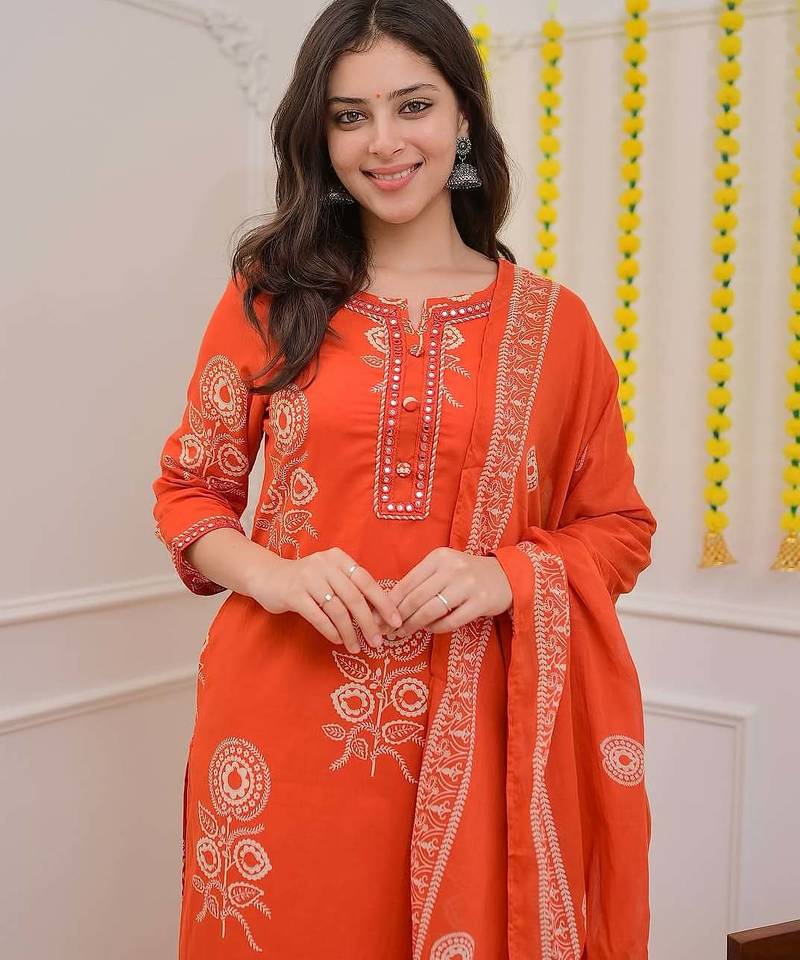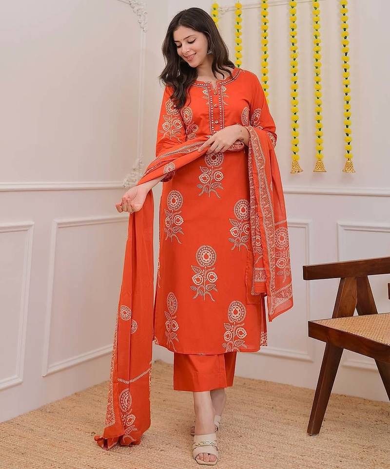 Product Name | Women Pure Cotton Printed Orange Kurta With Pant And Dupatta | |