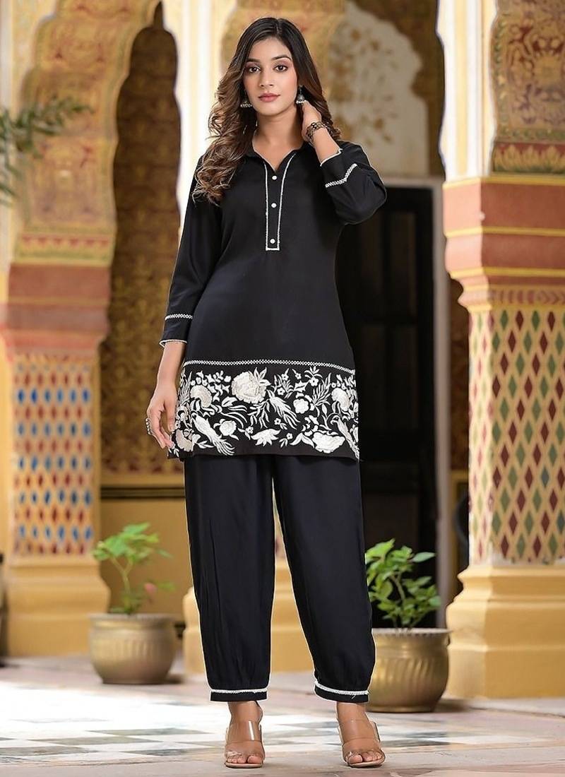 | Product Name | Floral Embroidered Black Collar Neck Rayon Co Ord Set | |