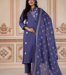 Floral embroidered blue round neck kurta set with trouser and dupatta