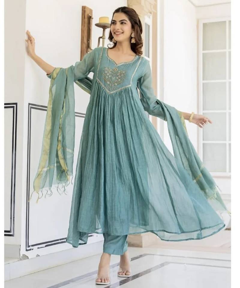 | Product Description | Refresh Your Ethnic Collection With This Floral Embroidered Blue Pure Cotton Kurta Set, Designed For Modern Women Who Love Comfort Blended With Elegance. Crafted From Soft, Breathable Cotton, This Kurta Set Keeps You Cool While Delivering A Refined Festive Appeal. The V Neck Kurta Is Adorned With Delicate Floral Embroidery That Enhances The Soothing Blue Tone Beautifully. Paired With Matching Cotton Trousers And A Coordinated Dupatta, This Ensemble Is Perfect For Festive Occasions, Office Wear, Daytime Functions, And Casual Celebrations. Product Details: Product Type: Kurta Set With Trouser & Dupatta Color: Blue Fabric: Pure Cotton Pattern: Floral Embroidered Neckline: V Neck Bottom: Matching Cotton Trouser Dupatta: Coordinated Cotton Dupatta Sizes Available: M, L, Xl, Xxl, 3 Xl Occasion: Festive Wear, Office Wear, Daily Ethnic Wear Care Instructions: Gentle Hand Wash / Mild Machine Wash Why You’ll Love It: Soft, Breathable Cotton Ideal For All Seasons Elegant Floral Embroidery Adds A Handcrafted Touch Soothing Blue Shade For Graceful Everyday Styling Versatile Three Piece Set For Multiple Occasions |