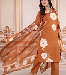 Floral embroidered brown round neck kurta set with trouser and dupatta