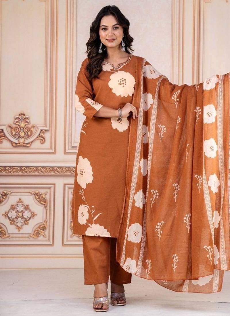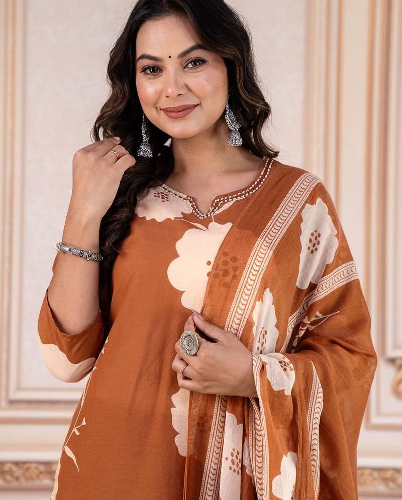 | Product Description | Step Into Subtle Sophistication With This Floral Embroidered Brown Kurta Set, Crafted To Bring Effortless Elegance To Your Ethnic Wardrobe. Featuring Delicate Floral Patterns On A Warm Brown Base, The Set Includes A Straight Fit Kurta, Comfortable Trouser, And A Coordinated Dupatta That Enhances Your Overall Look. Perfect For Women Who Prefer Understated Yet Classy Ethnic Wear With A Modern Touch. Key Features Soothing Brown Shade Ideal For Everyday And Festive Wear Beautiful Floral Embroidery For A Timeless Ethnic Appeal Comfortable Round Neck Design With 3/4th Sleeves Straight Cut Kurta For A Flattering Silhouette Matching Trouser & Lightweight Printed Dupatta Available Sizes: M, L, Xl, Xxl Perfect For Office Wear, Festive Gatherings, Pooja Ceremonies, Casual Outings, And Family Events. |