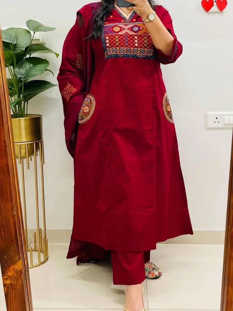 | Product Description | Make A Rich, Regal Statement With This Maroon Floral Embroidered Cotton Kurta Set, Crafted For Women Who Love Elegance With Comfort. The Deep Maroon Shade Enhances The Fine Embroidery On The Yoke, Creating A Premium Handcrafted Look. The Kurta Includes Side Motif Patches, Perfectly Coordinated Trousers, And A Beautifully Printed Dupatta To Complete The Ensemble. ⭐ Key Features Fabric: Premium Soft Cotton Color: Maroon Design: Elaborate Floral Embroidered Yoke + Side Motifs Neckline: Embroidered V Neck Sizes: M–3 Xl Set Includes: Kurta + Trouser + Dupatta Comfort: Lightweight, Breathable & Skin Friendly |