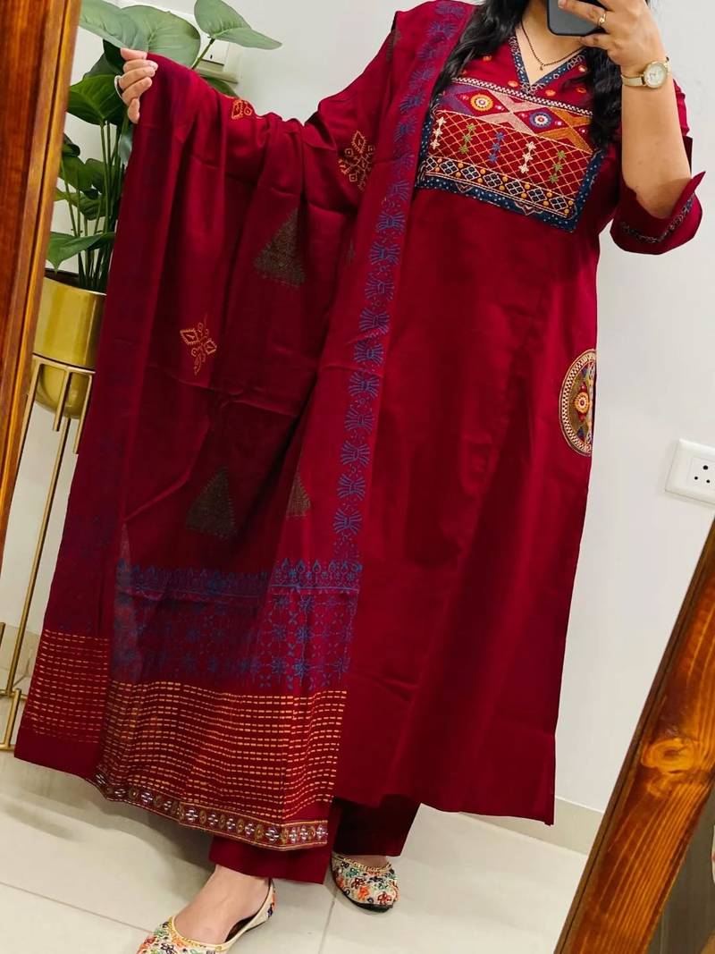 | Product Name | Floral Embroidered Maroon V Neck Pure Cotton Kurta Set With Trouser & Dupatta | |