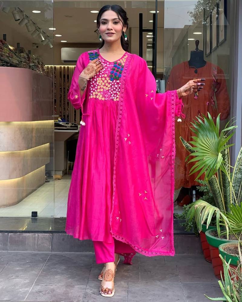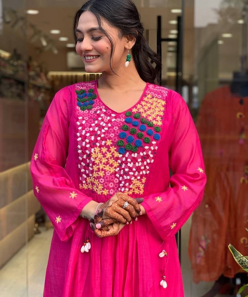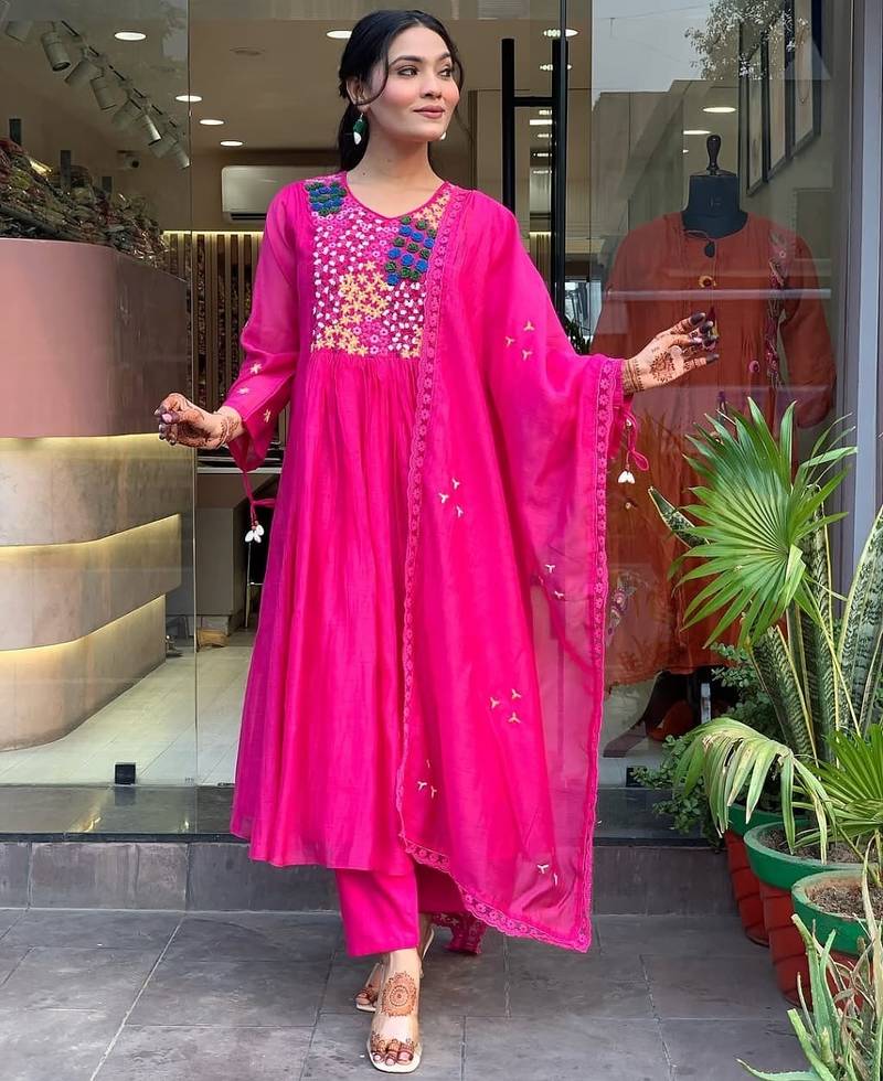 | Product Description | Elevate Your Festive And Everyday Ethnic Wardrobe With This Stunning Pink Floral Embroidered Kurta Set, Crafted In 100% Pure Cotton For Unmatched Comfort And Elegance. The Vibrant Pink Color, Paired With Intricate Embroidery And A Flowy Silhouette, Makes It The Perfect Outfit For Celebrations, Family Gatherings, Festivals, Or Casual Outings. ✨ Product Highlights Fabric: Premium Pure Cotton Neckline: Attractive V Neck With Detailed Floral Embroidery Work: Hand Inspired Floral Thread Embroidery With Mirror Accents Sleeves: Full Sleeves With Delicate Tassel Embellishments Pant Style: Comfortable Straight Fit Cotton Trousers Dupatta: Matching Soft Cotton Dupatta With Embroidered Motifs Fit: Flared Anarkali Style Kurta For An Elegant And Flattering Silhouette Sizes Available: M, L, Xl, Xxl 💕 Why You’ll Love It Breathable Pure Cotton Keeps You Cool And Comfortable All Day. Gorgeous Pink Shade Enhances Every Skin Tone. Perfect Blend Of Traditional Embroidery With A Modern Flared Look. Ideal For Festive Wear, Haldi/Mehendi Ceremonies, Casual Outings & Kitty Parties. 📏 Perfect For ✔ Festive Events
