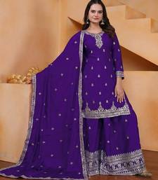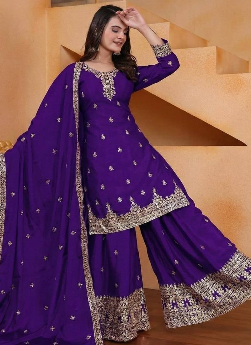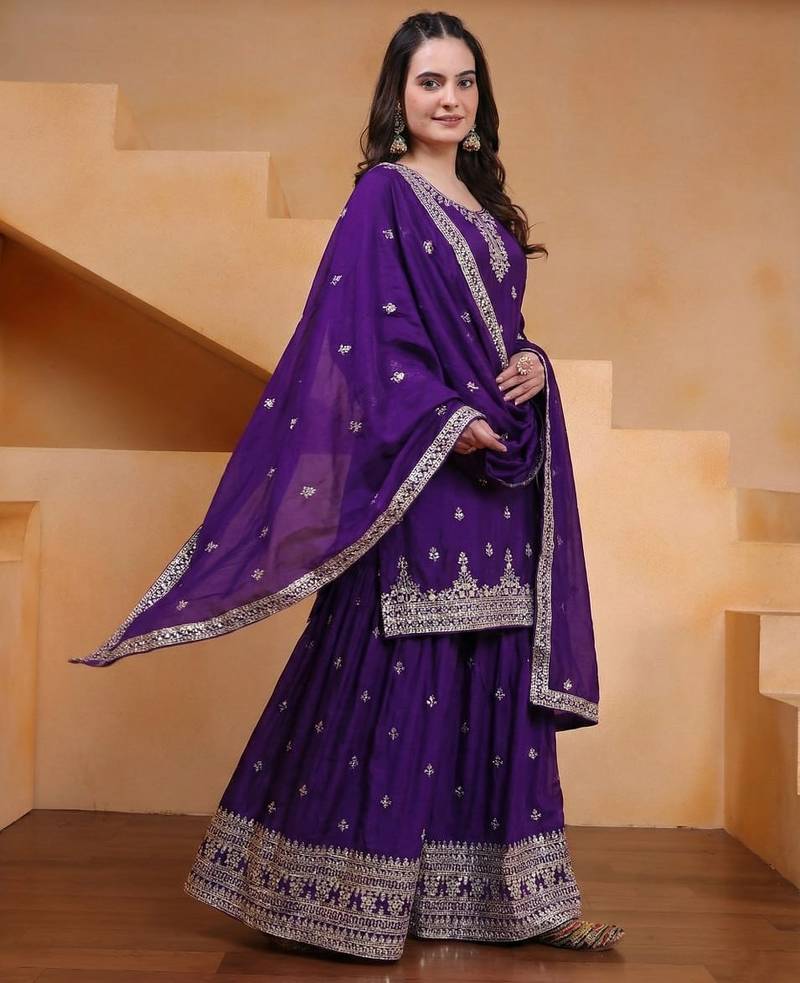 Designer chinnon embroidered sharara suit stitched