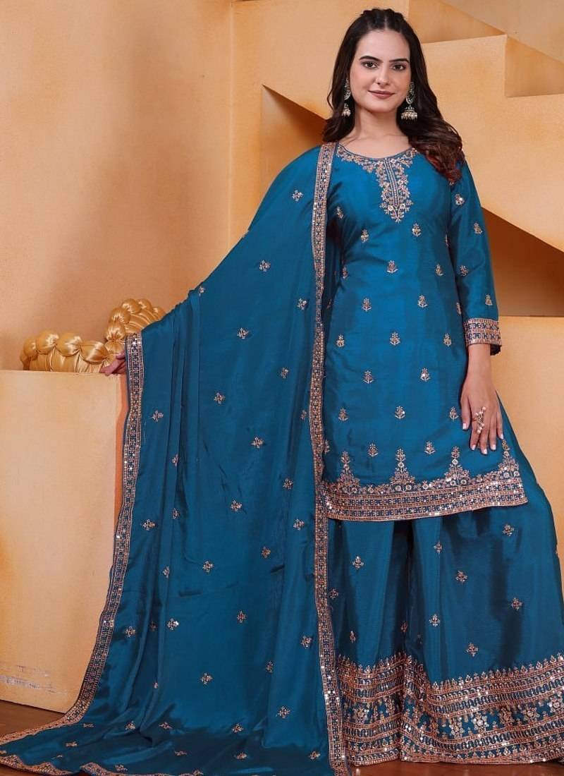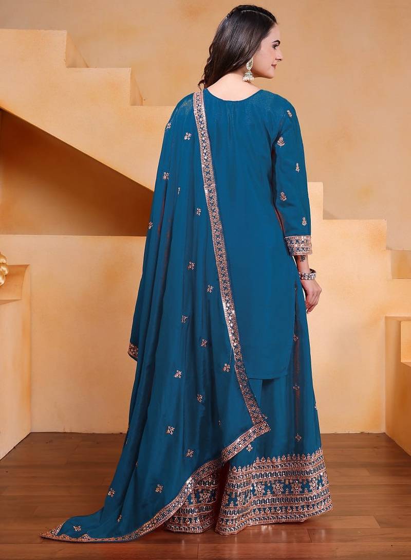 Designer chinnon embroidered sharara suit stitched