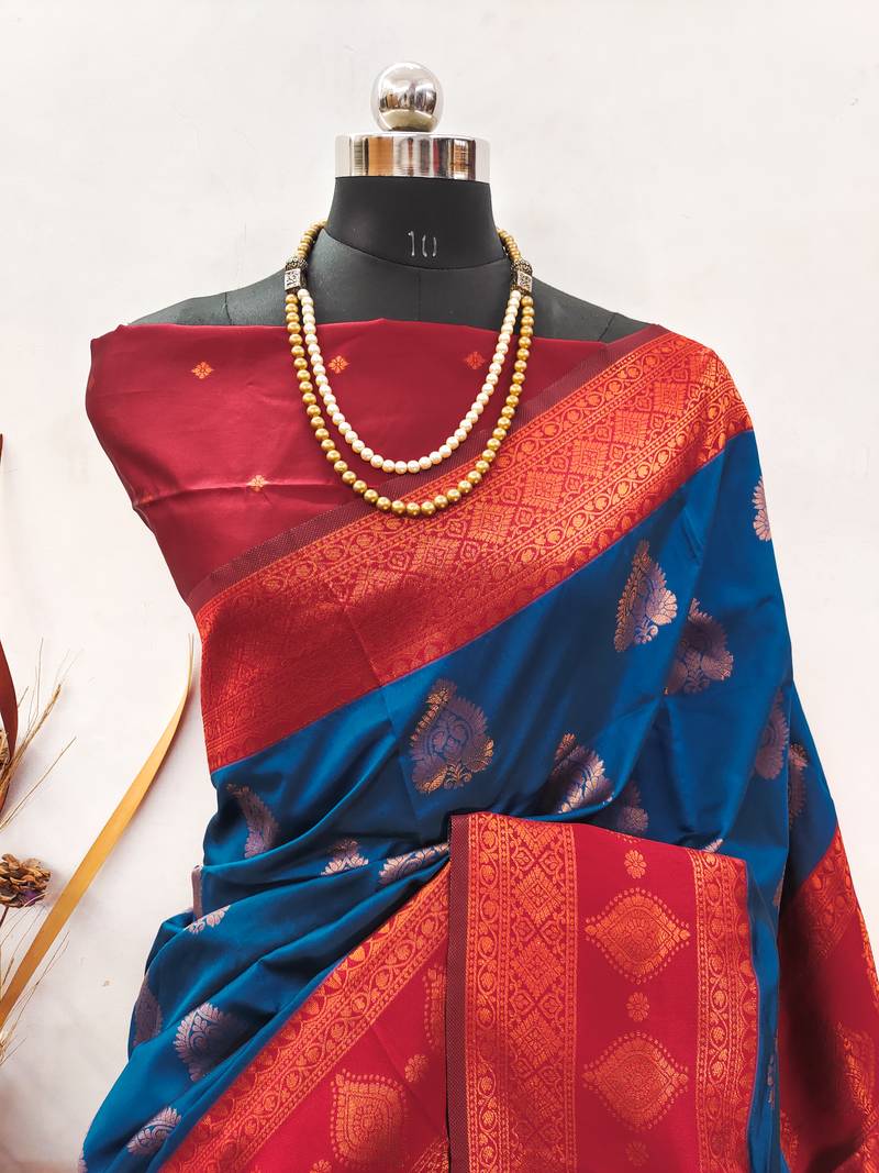 | Product Name | Blue Red Soft Silk Blend Banarasi Jacuard Work Designer Party Wear Saree With Unstitched Blouse Piece | |
