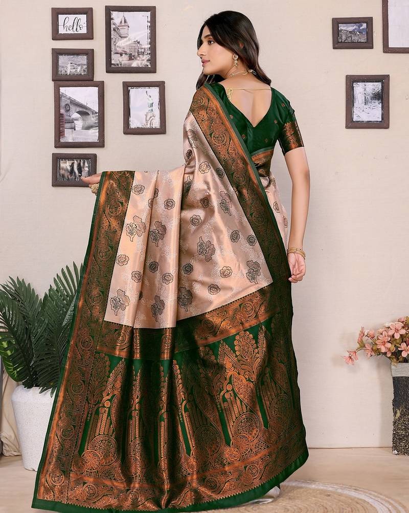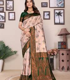 Cream green soft silk blend banarasi jacuard work designer party wear saree with unstitched blouse piece