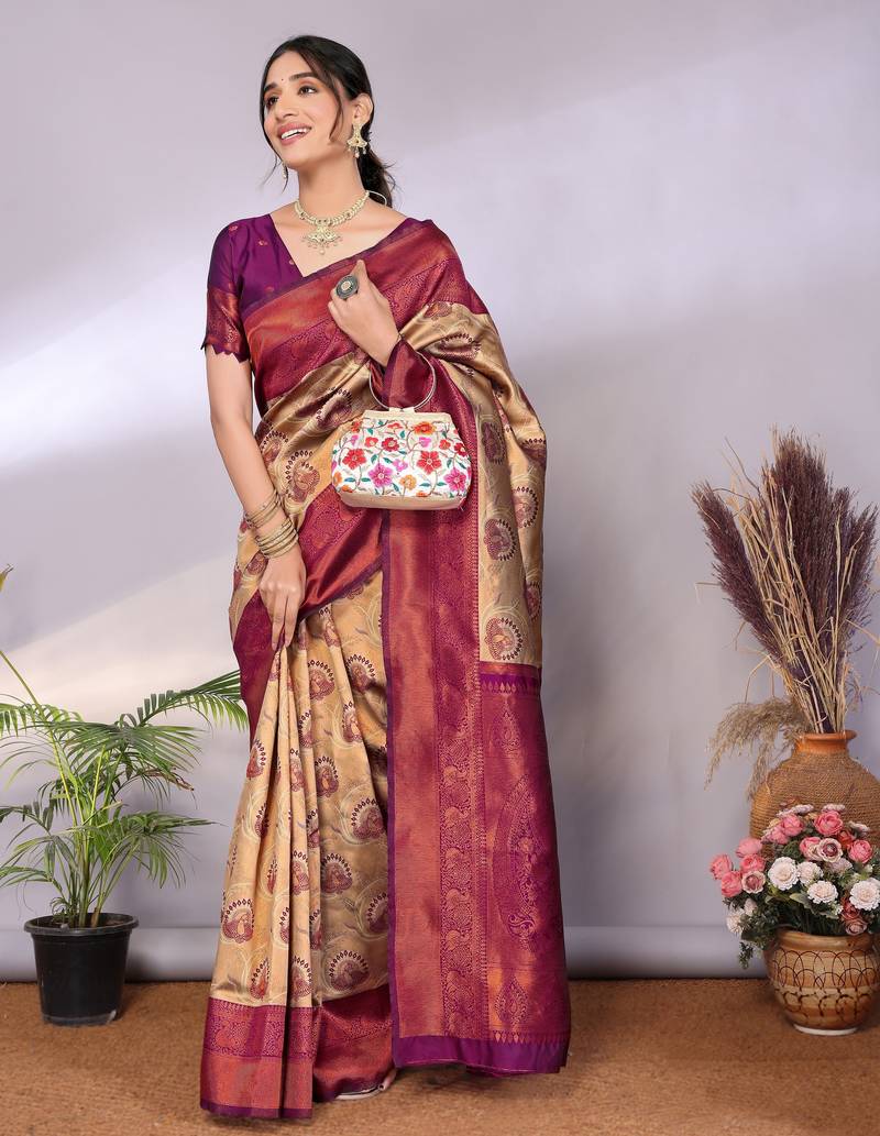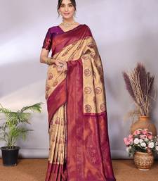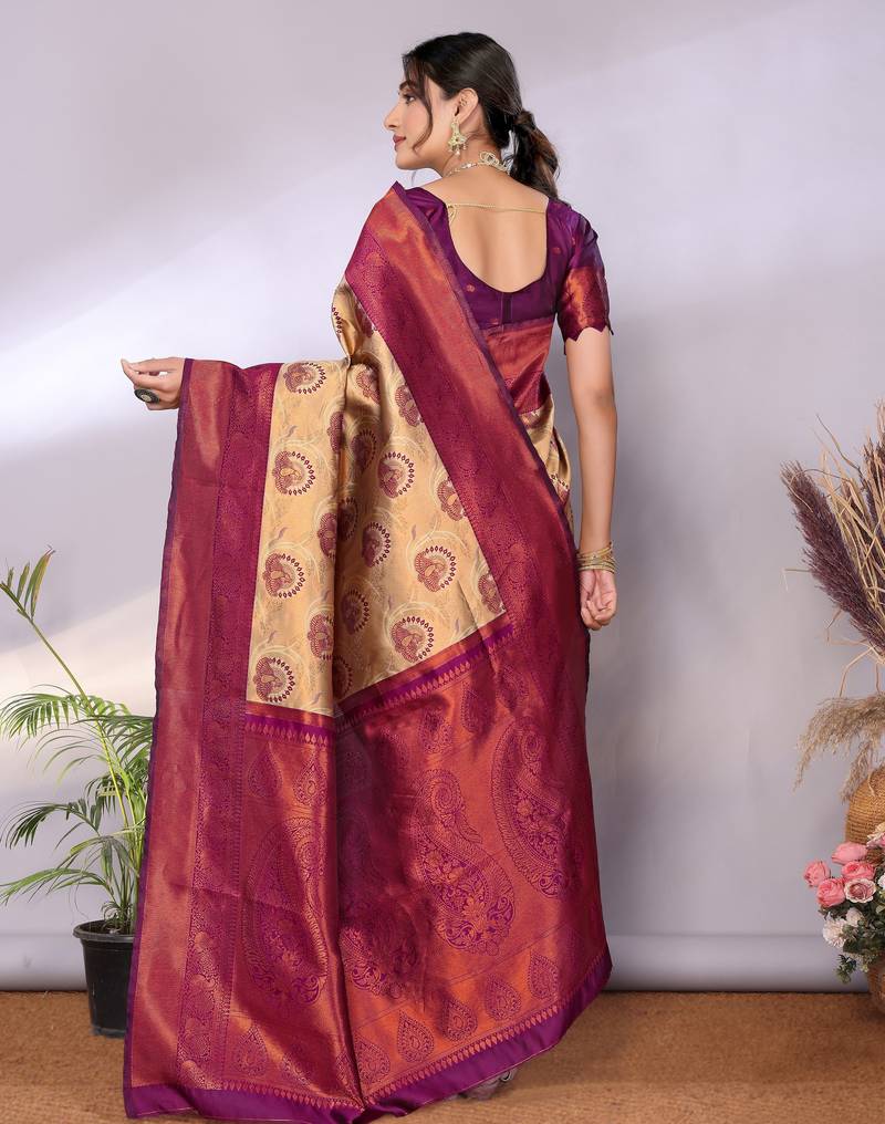 Cream wine soft silk blend banarasi jacuard work designer party wear saree with unstitched blouse piece