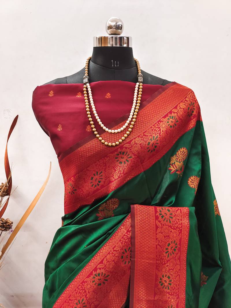 Product Name Green Red Soft Silk Blend Banarasi Jacuard Work Designer Party Wear Saree With Unstitched Blouse Piece