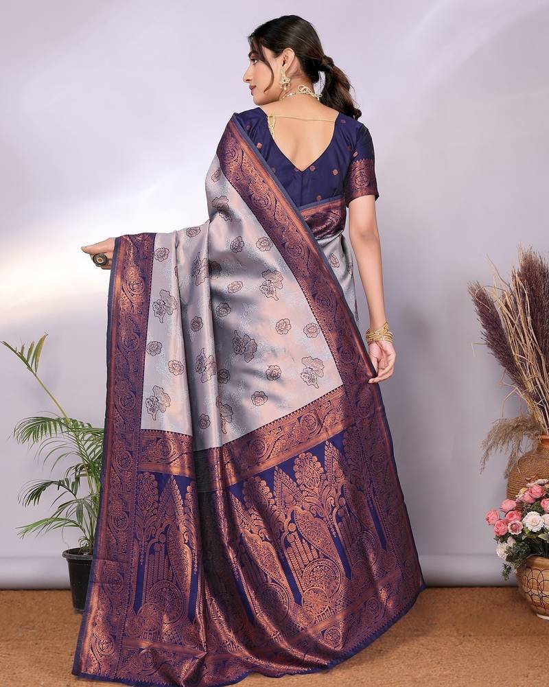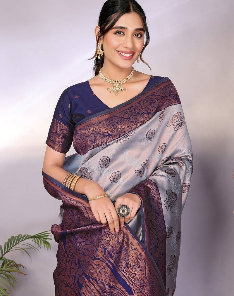 Grey neavy blue soft silk blend banarasi jacuard work designer party wear saree with unstitched blouse piece