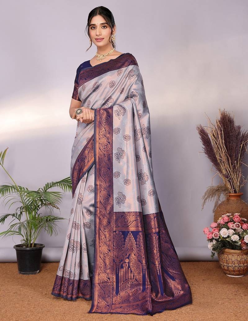 Product Name Grey Neavy Blue Soft Silk Blend Banarasi Jacuard Work Designer Party Wear Saree With Unstitched Blouse Piece