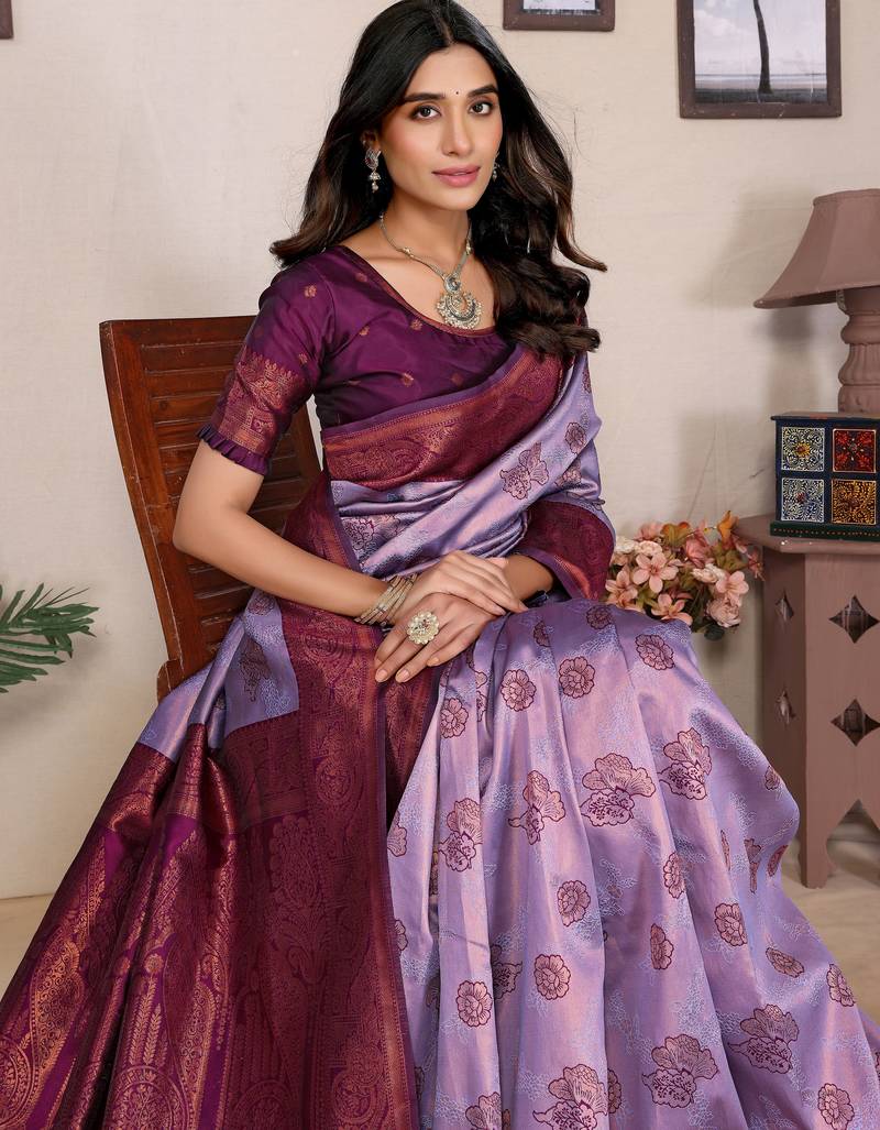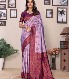 Lavender wine soft silk blend banarasi jacuard work designer party wear saree with unstitched blouse piece