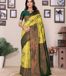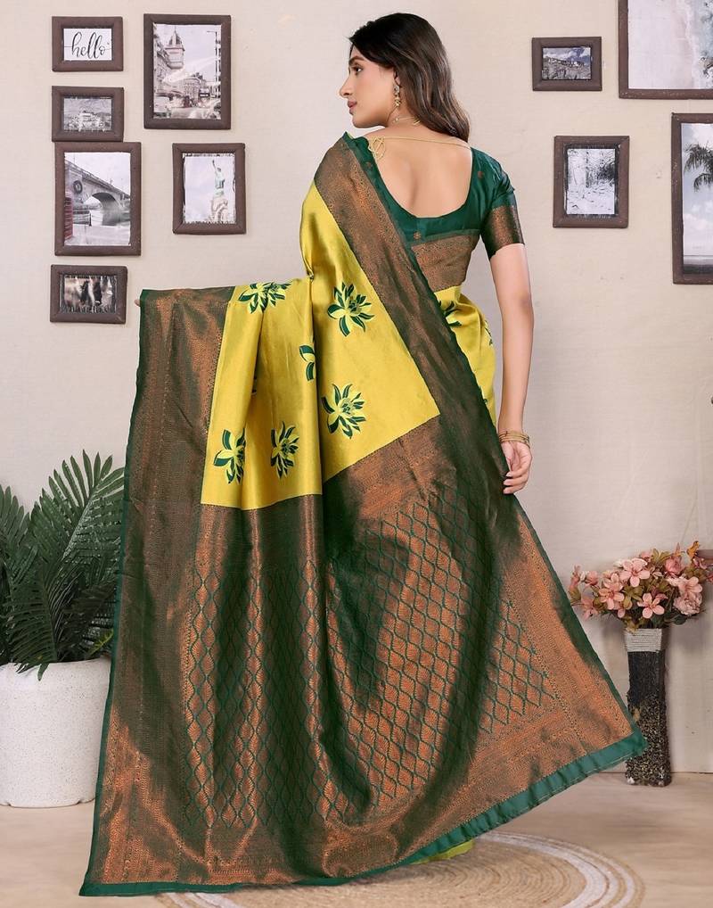Lemon green soft silk blend banarasi jacuard work designer party wear saree with unstitched blouse piece