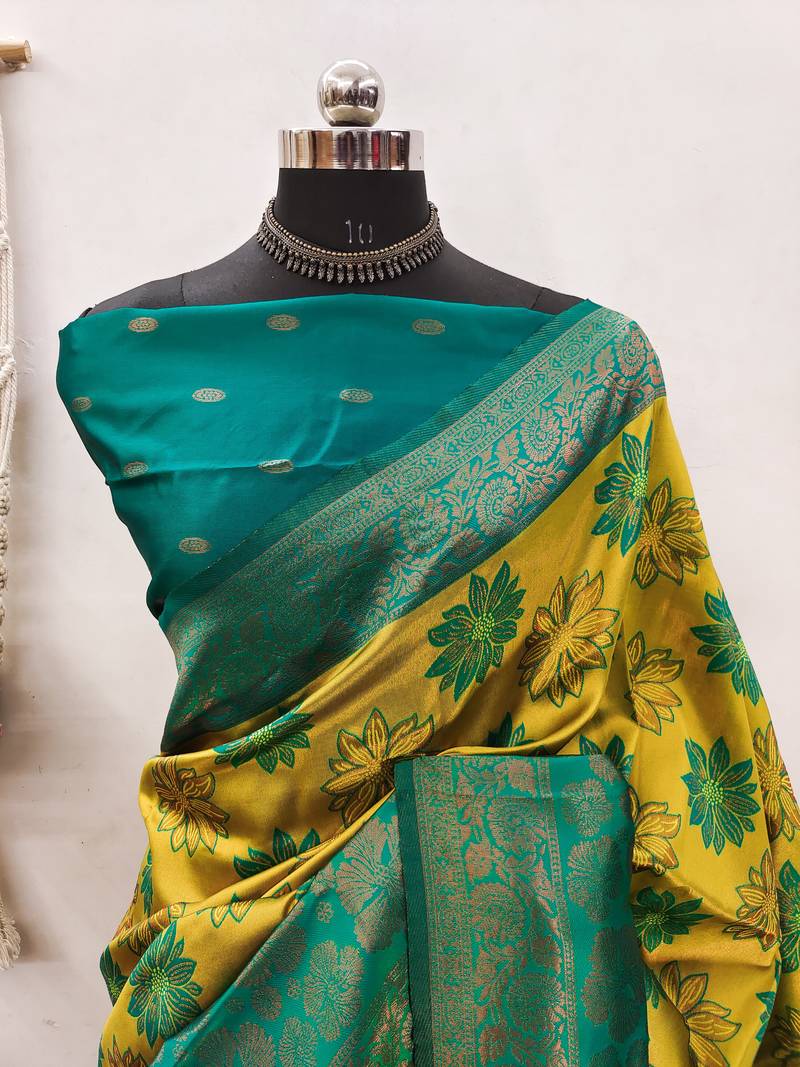 Lemon rama  soft silk blend banarasi jacuard work designer party wear saree with unstitched blouse piece