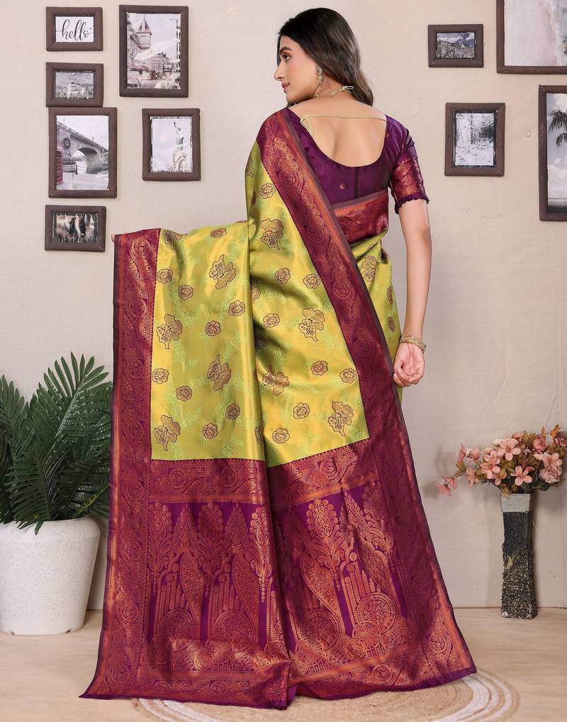 Lemon wine soft silk blend banarasi jacuard work designer party wear saree with unstitched blouse piece