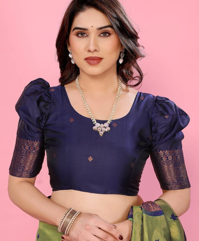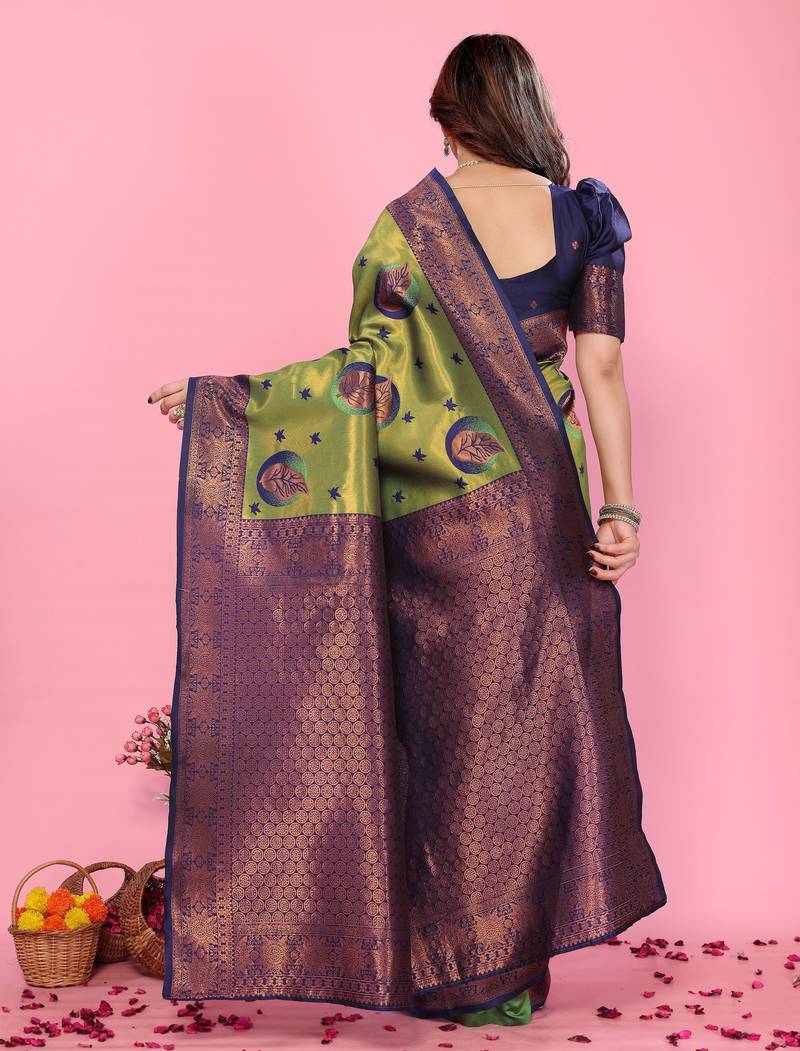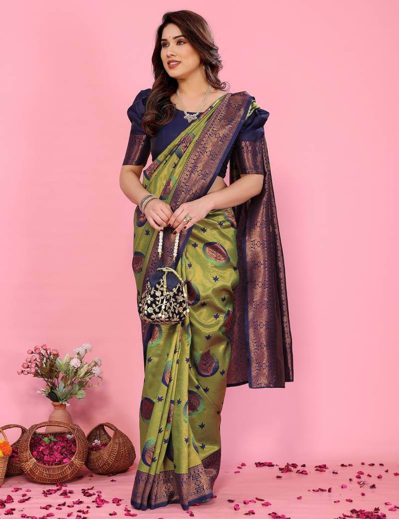 Mehendi blue wine soft silk blend banarasi jacuard work designer party wear saree with unstitched blouse piece