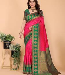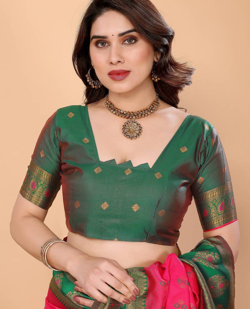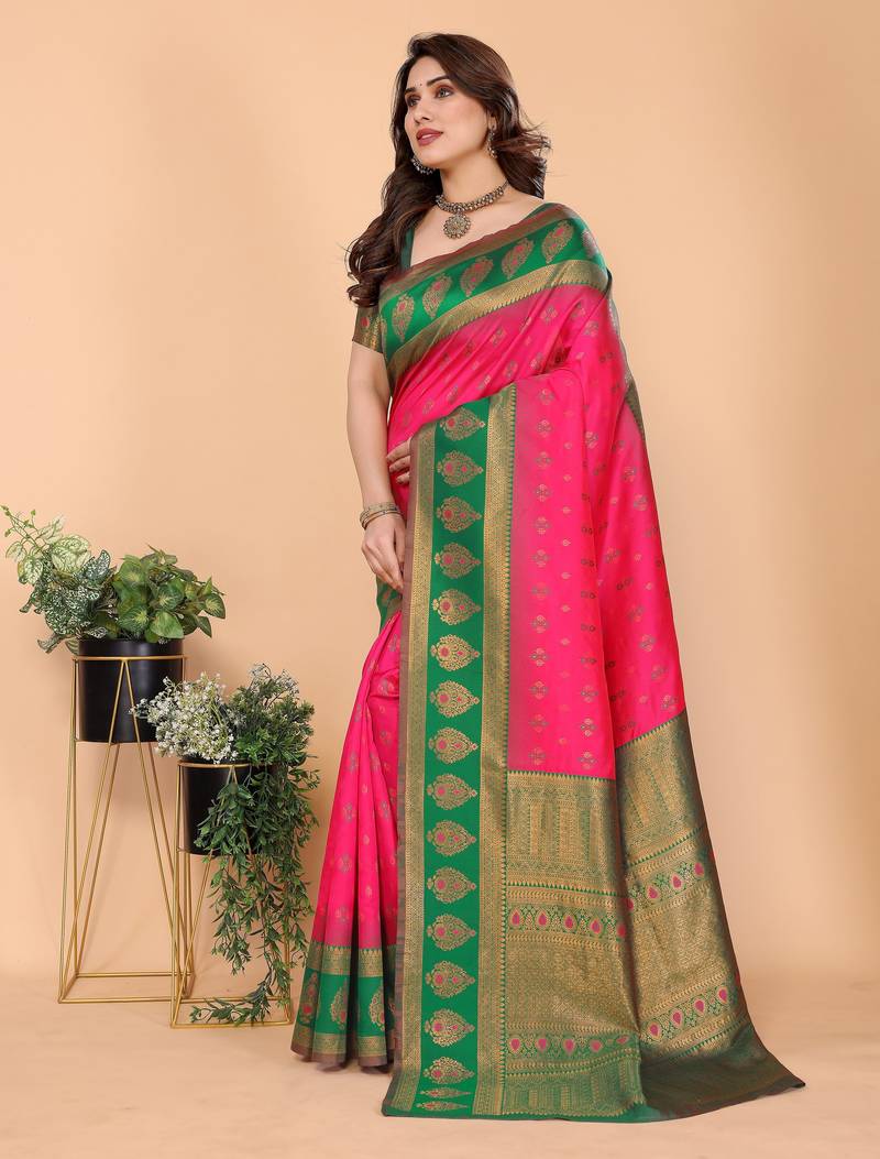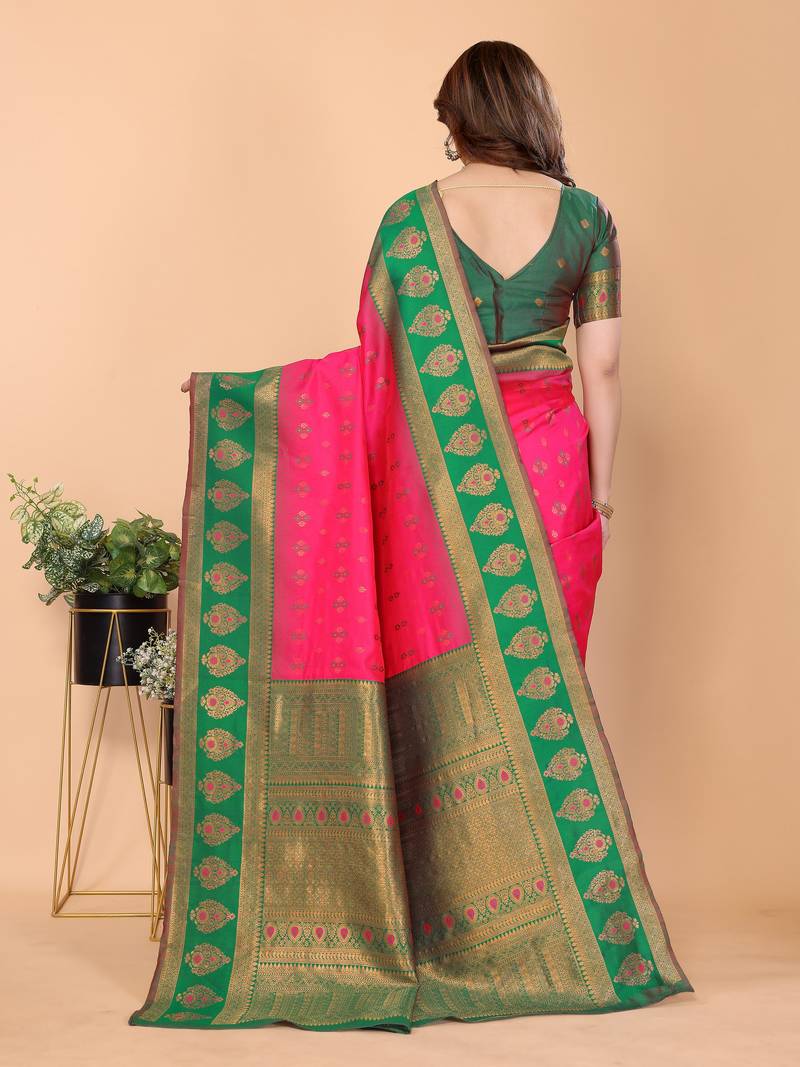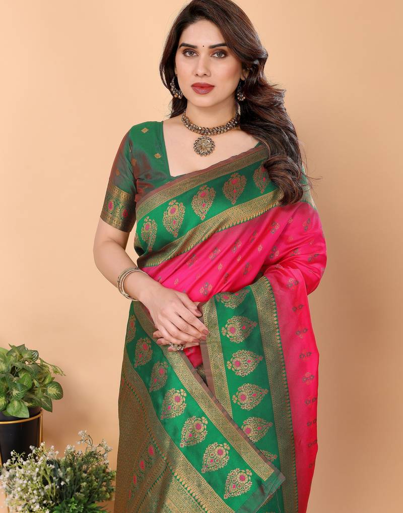 Pink green soft silk blend banarasi jacuard work designer party wear saree with unstitched blouse piece