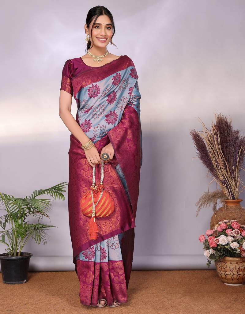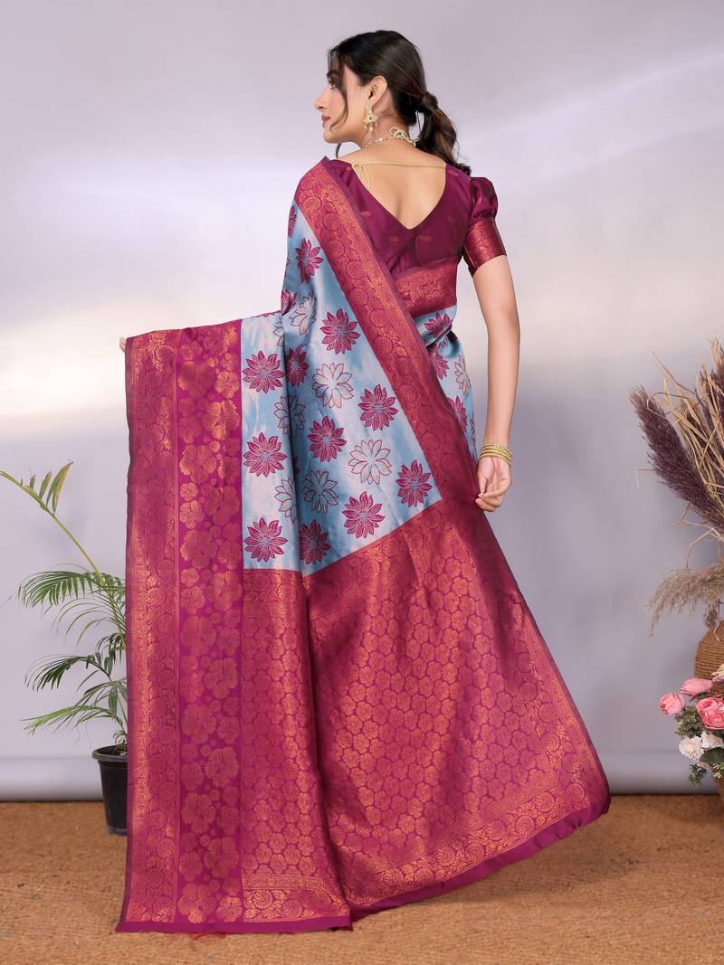 Sky wine soft silk blend banarasi jacuard work designer party wear saree with unstitched blouse piece