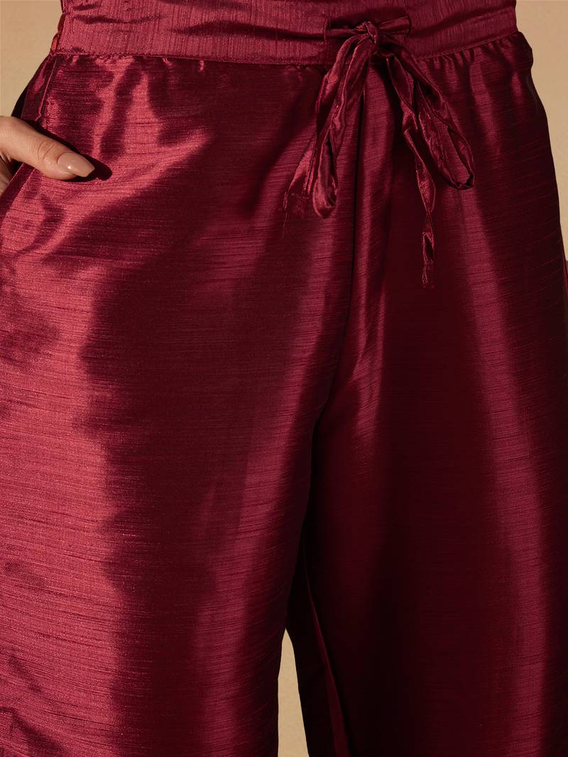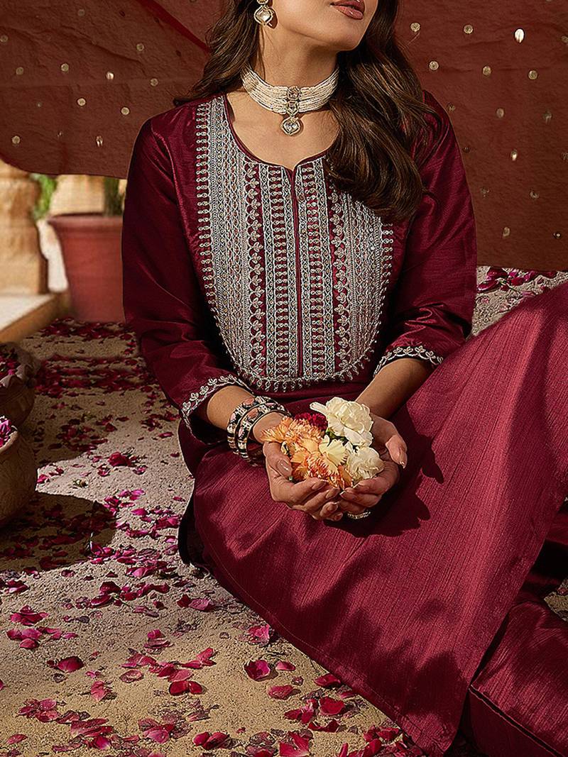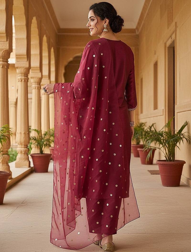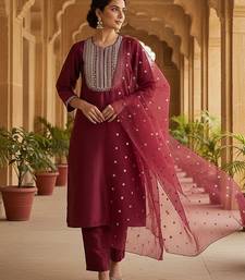 Maroon color embroidered poly silk styles kurta trouser with dupatta