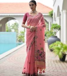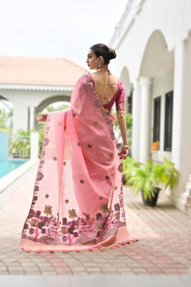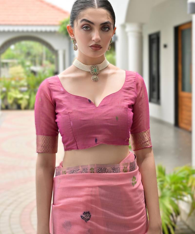 Baby pink premium soft chanderi cotton saree with resham flower weaving & contrast blouse