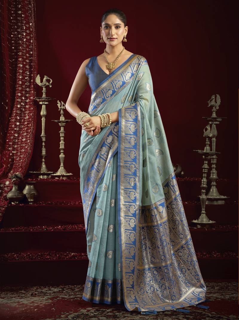 | • | Saree | : | Color- Sky Blue / Fabric- Silk Blend |