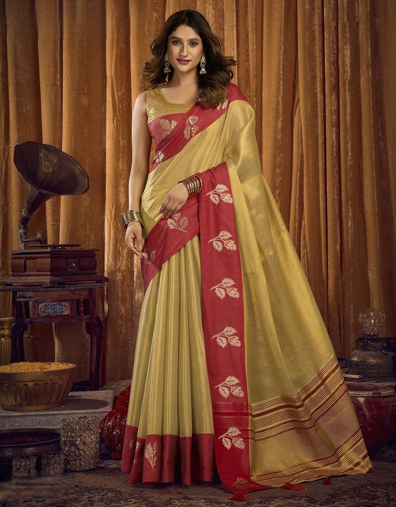 | Embellish | Elevate Your Festive Wardrobe With This Exquisite Soft Tissue Saree, Designed With A Rich Contrasting Border That Enhances Its Traditional Charm. | |