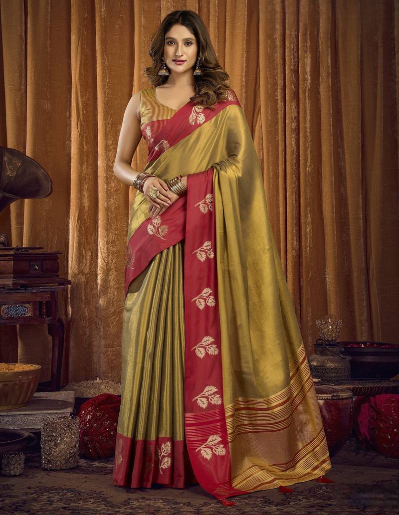 | Embellish | Elevate Your Festive Wardrobe With This Exquisite Soft Tissue Saree, Designed With A Rich Contrasting Border That Enhances Its Traditional Charm. | |