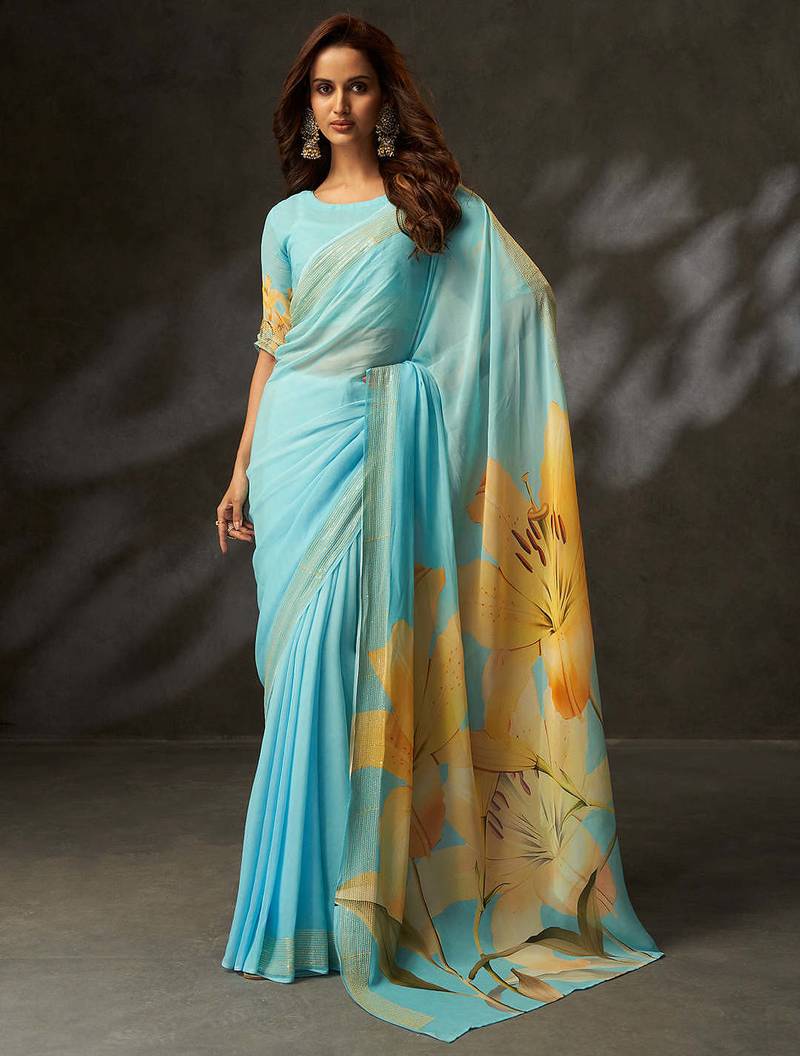 Georgette art silk digital printed saree with croset work border | unstitched blouse | premium quality