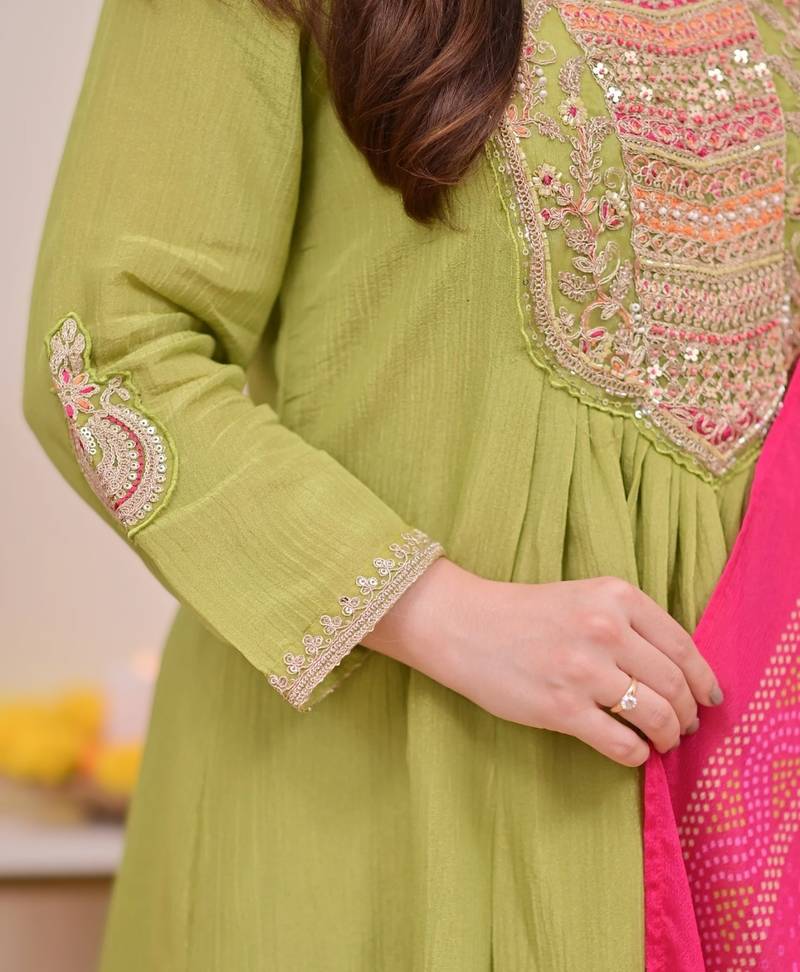 Green silk chinnon embroidered kurti set with pure silk dupatta stitched