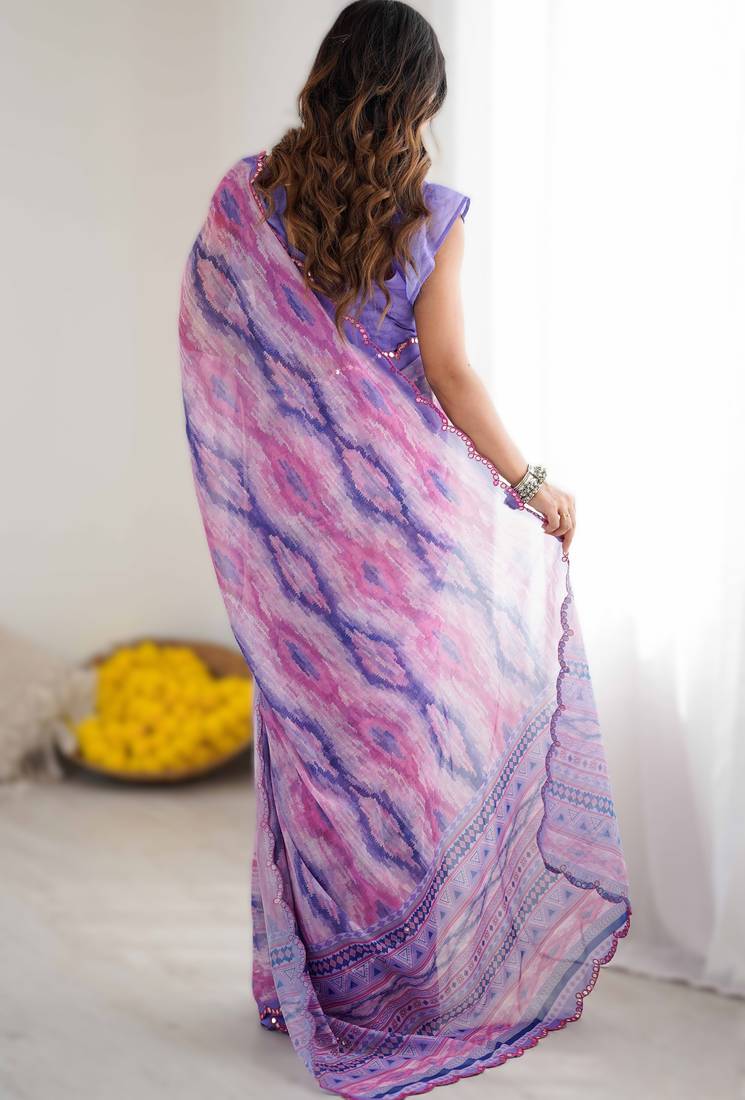Light purple heavy georgette printed saree with mirror work border & unstitched georgette silk blouse
