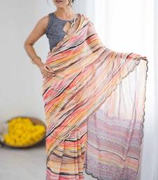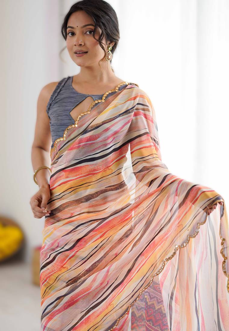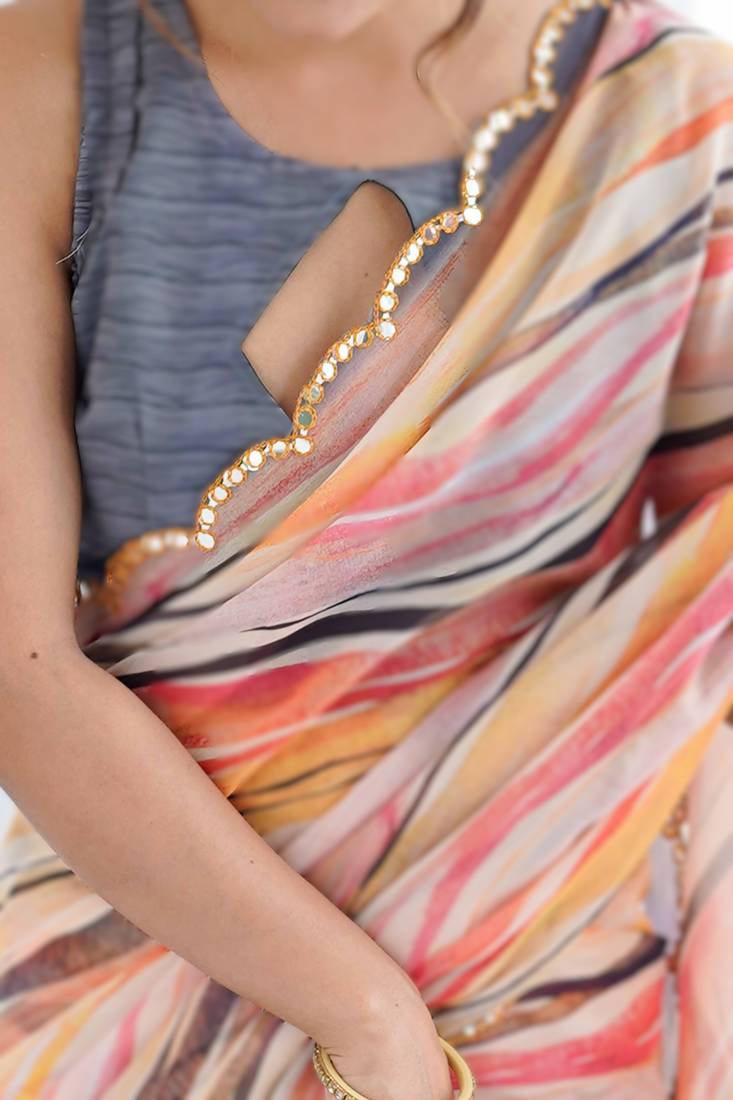 Multi color heavy georgette printed saree with mirror work border & unstitched georgette silk blouse
