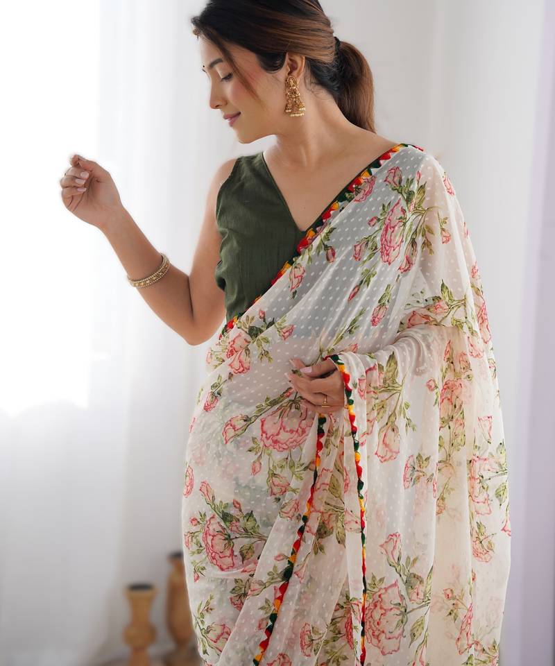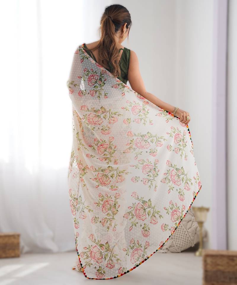 Off white multi-color flower butti work saree with colorful jumka lace border