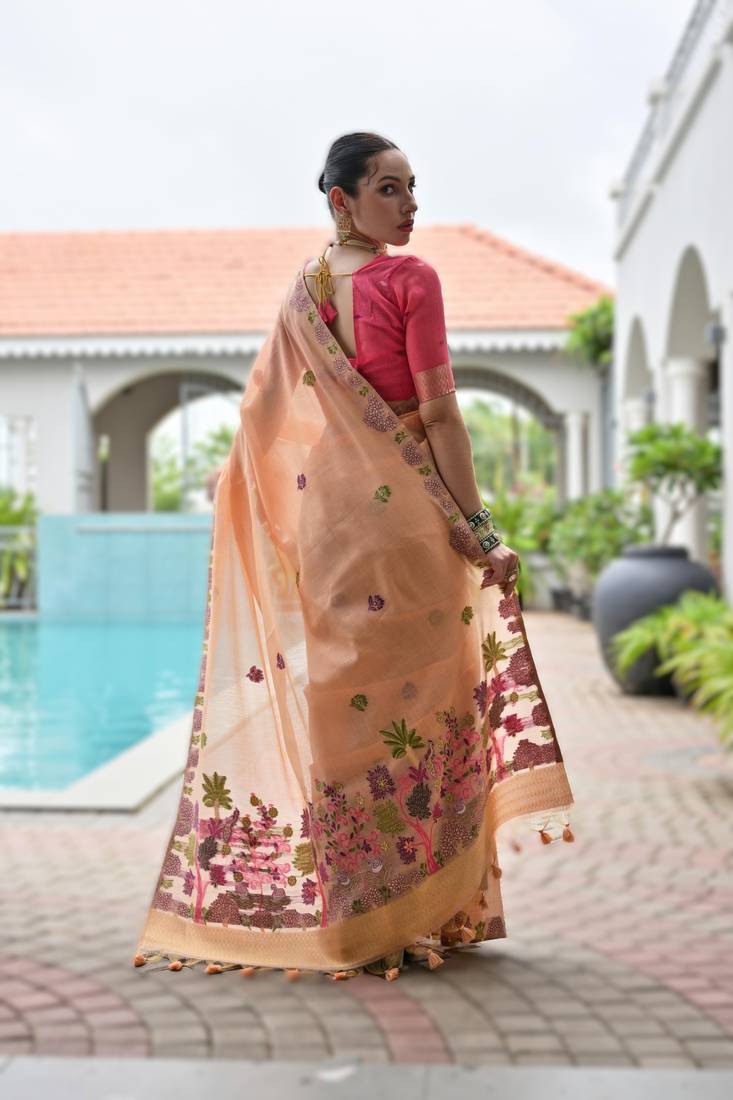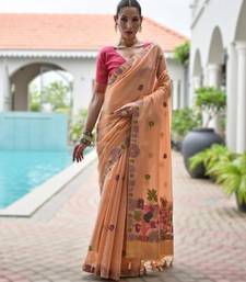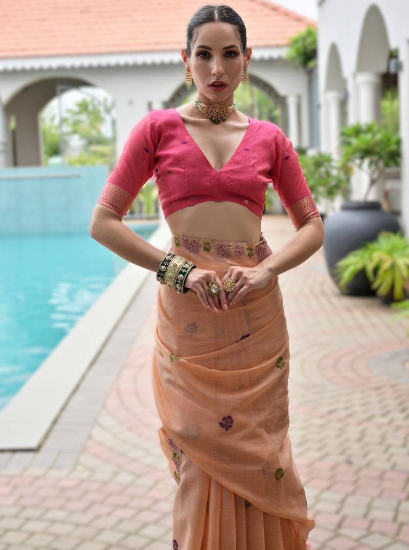 Peach premium soft chanderi cotton saree with resham flower weaving & contrast blouse