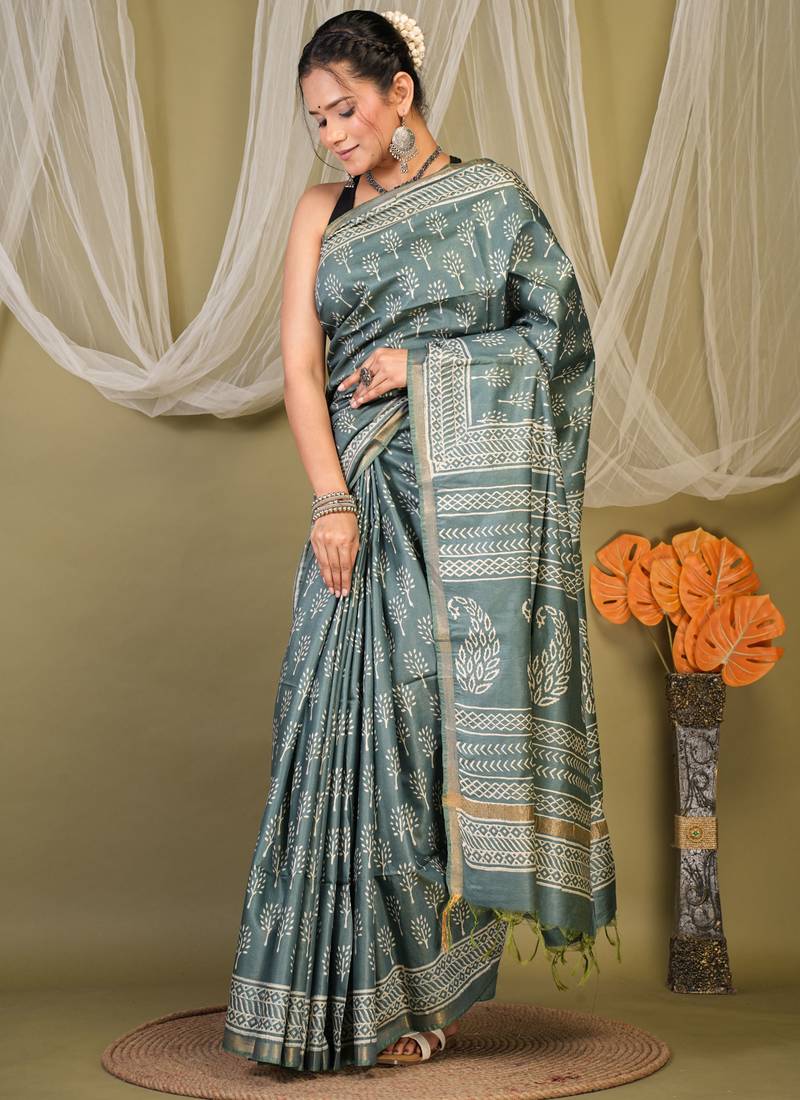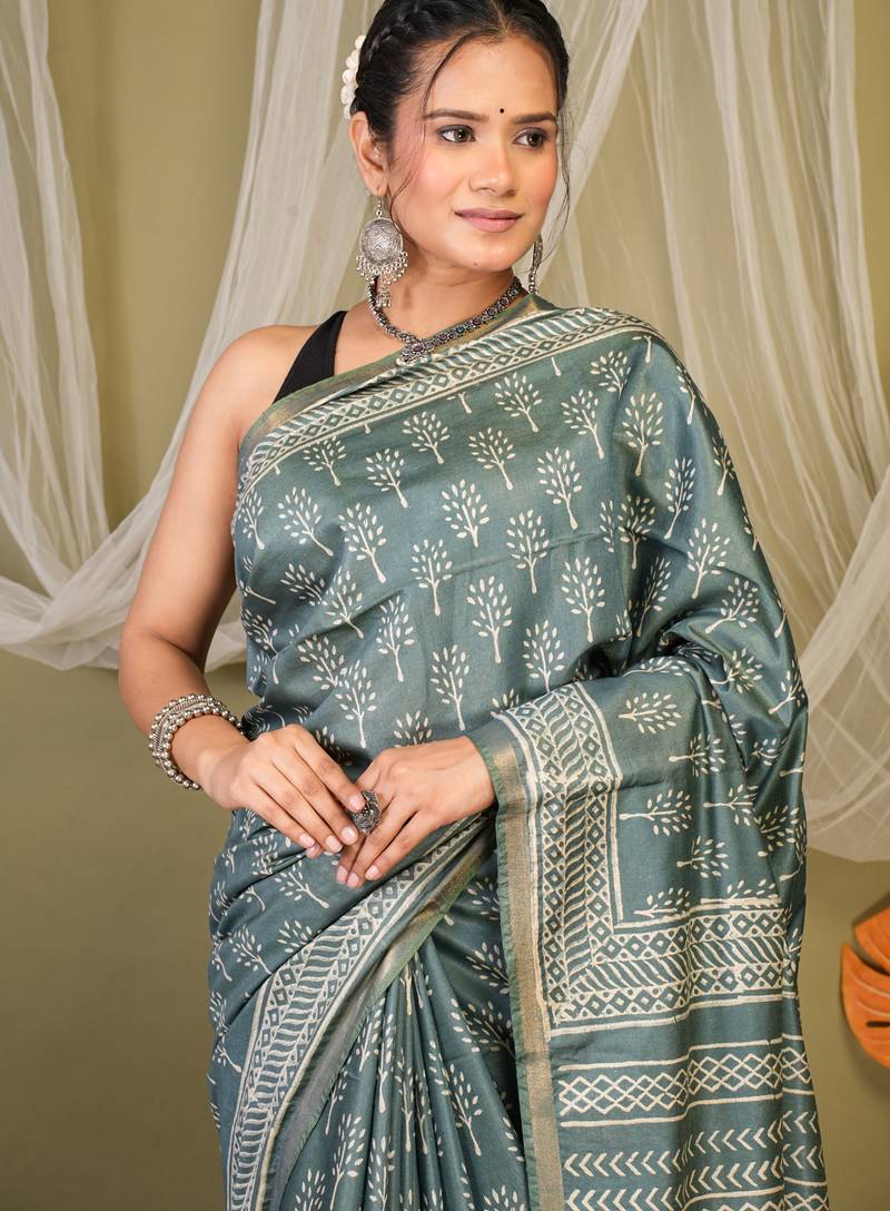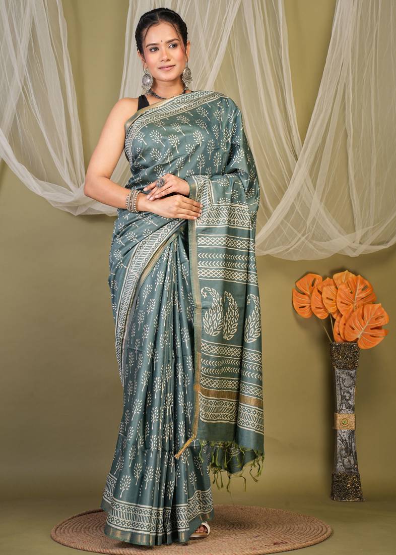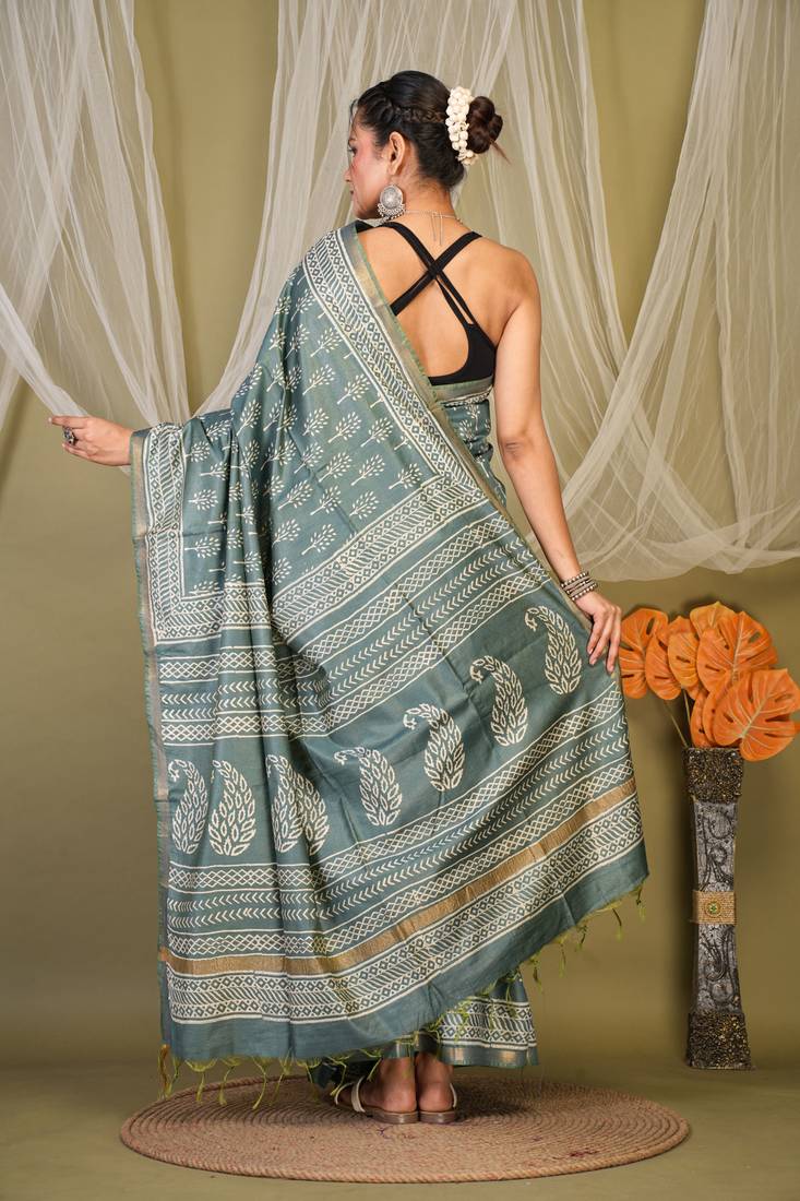 | Product Description | Made From Luxurious Cotton Silk, This Saree Offers A Soft, Airy Drape With A Hint Of Sheen—Making It Perfect For Long Festive Hours And Elegant Evenings.The Deep, Earthy Teal Green Hue Brings Warmth And Sophistication, Beautifully Complemented By Intricate Discharge Hand Block Prints In Delicate Floral And Paisley Patterns. A Subtle Yet Striking Golden Zari Border Adds A Regal Frame, While Fancy Tassels On The Pallu Offer A Playful, Refined Finish. |
