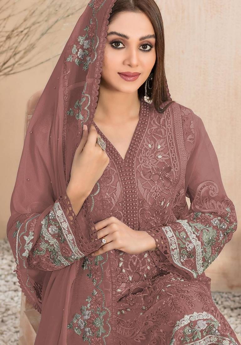 | • | Kameez | : | Color- Brown / Fabric- Faux Georgette |