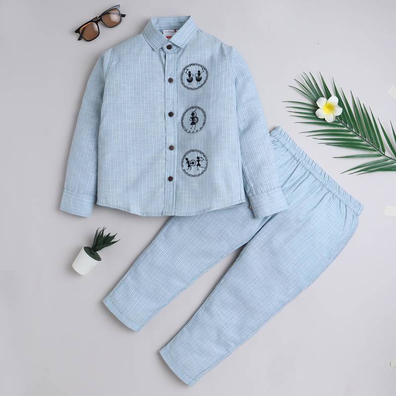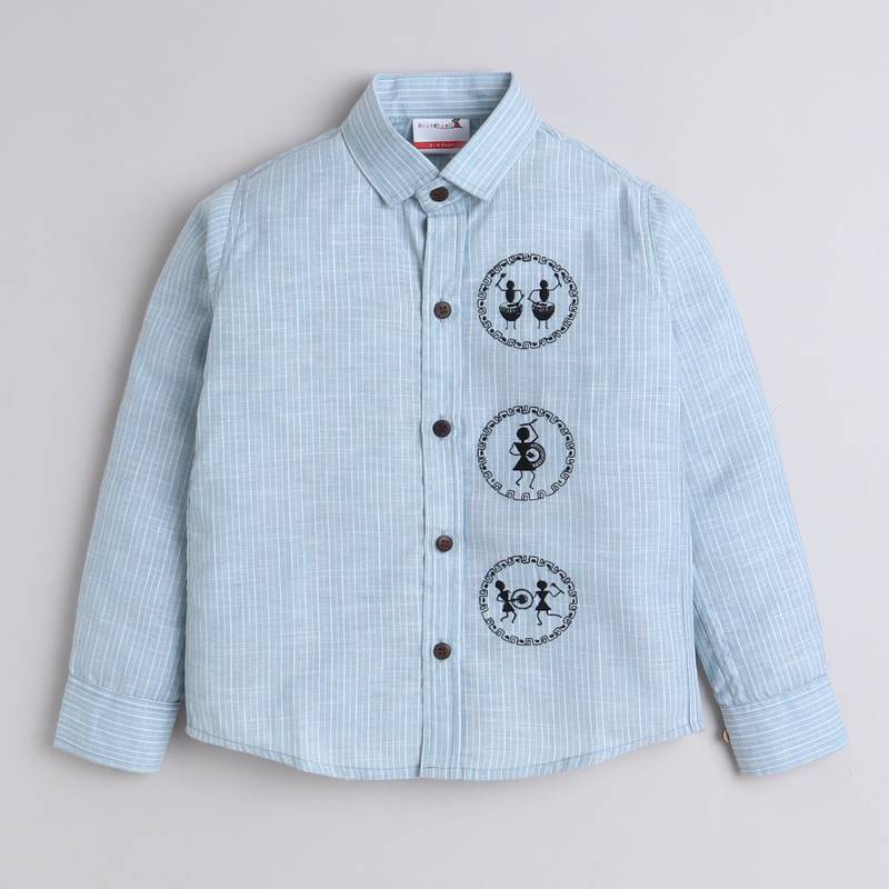 Product Description | Cotton Full Sleeves Warli Embroided Striped Shirt With Pant Co Ord Set Blue |