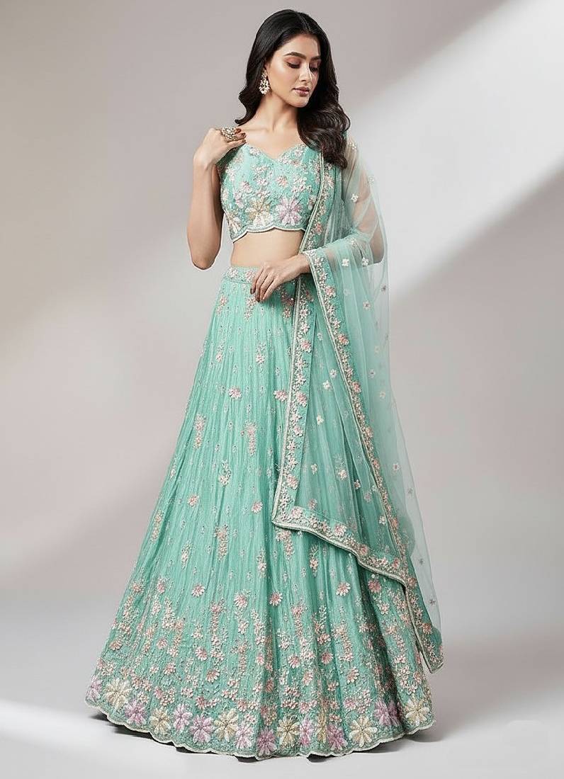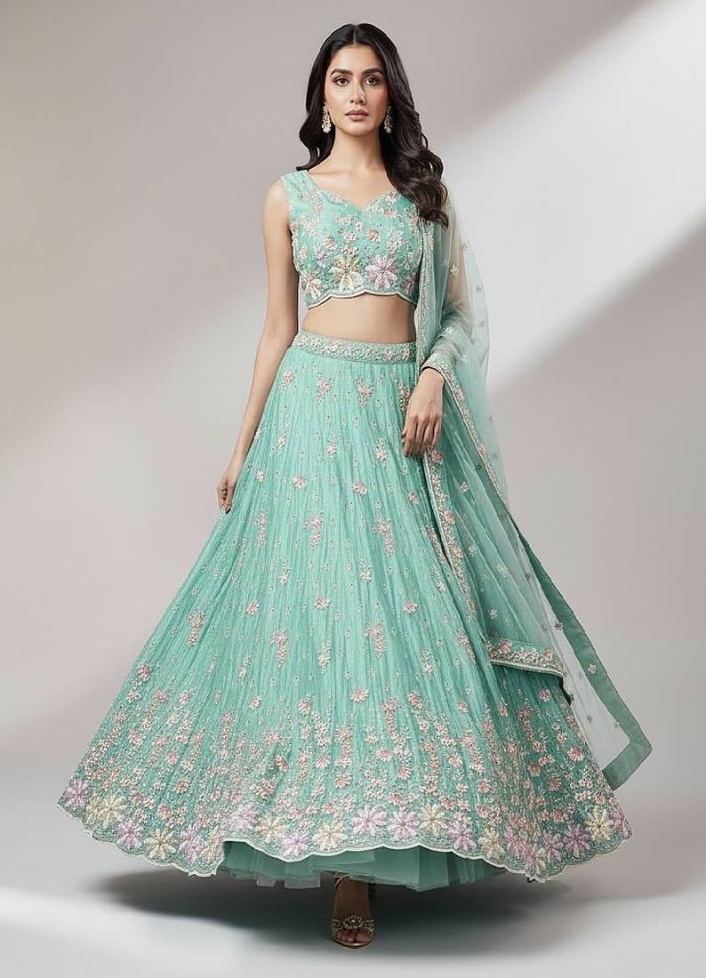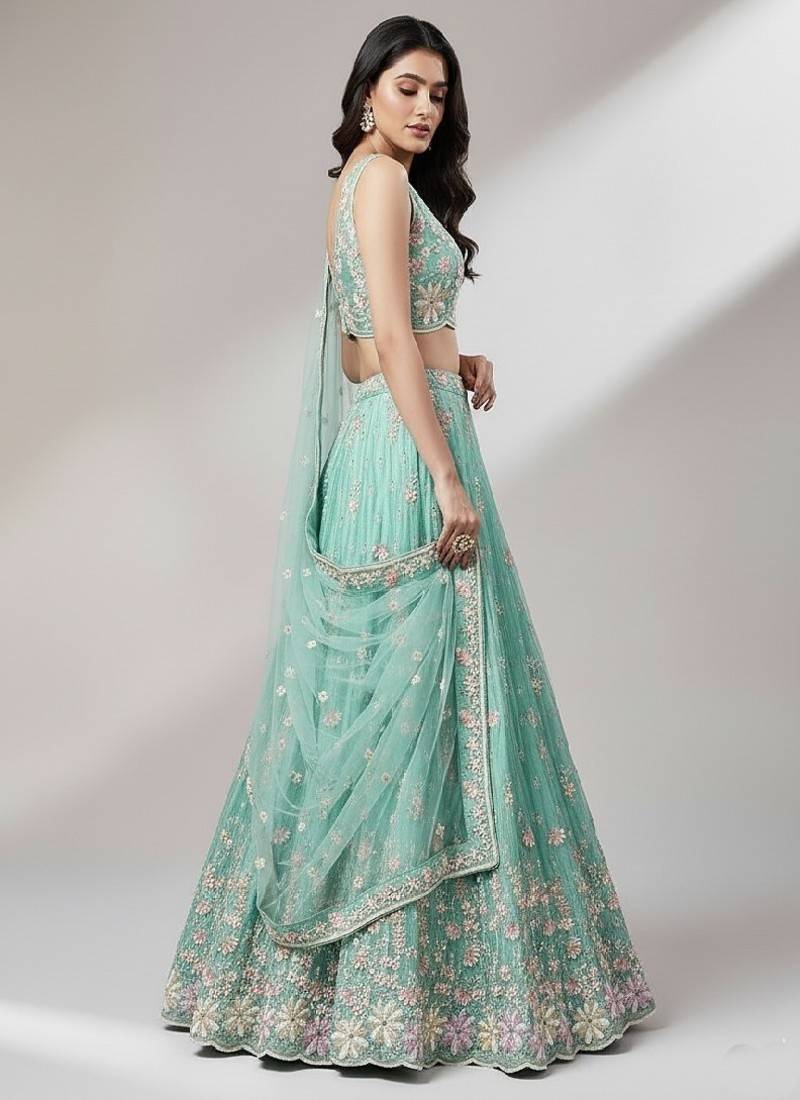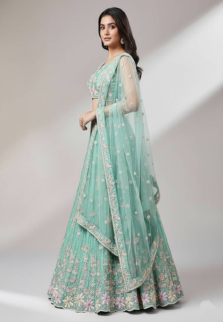 Sea green embroidery net lehenga choli with dupatta