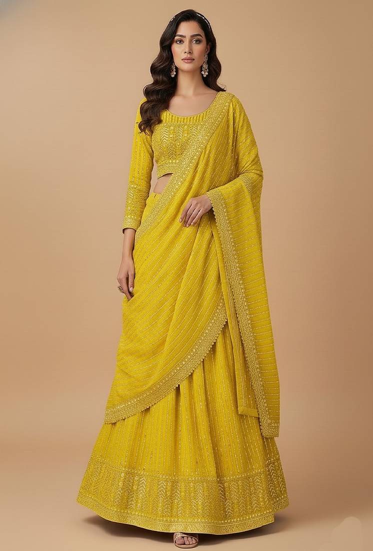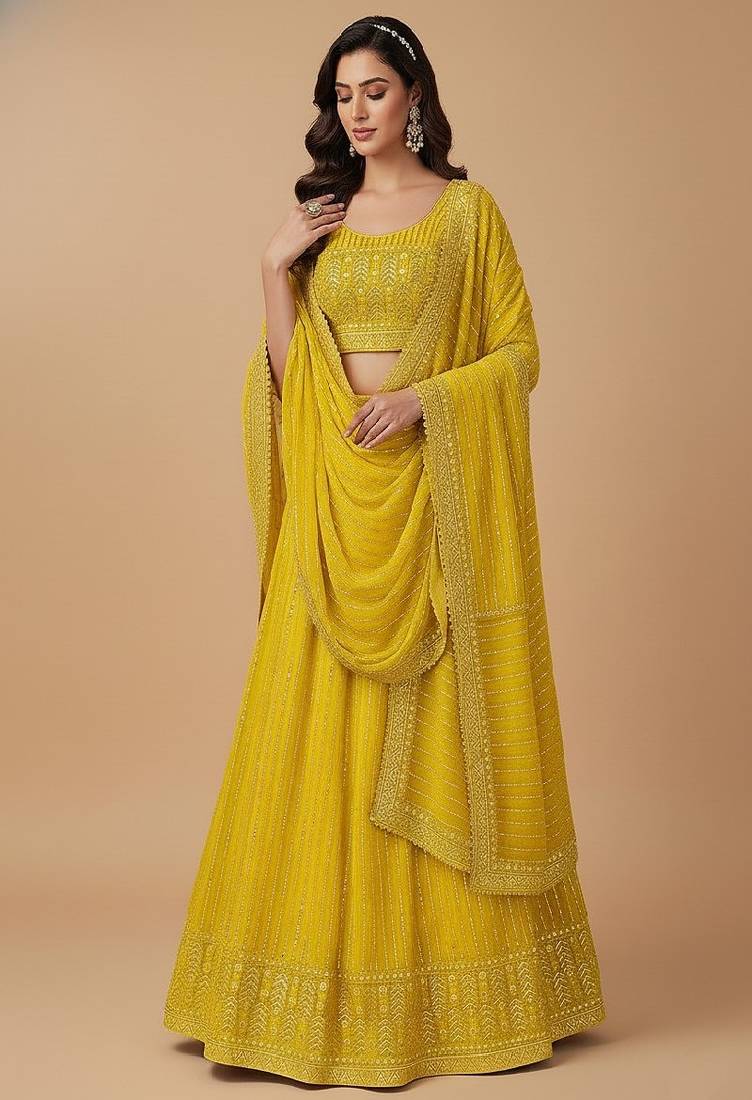 | Product Name | Yellow Multi Needle , 3mm Sequence , Coding , Embroidery , Zari Faux Georgette Lehenga Choli With Dupatta | |
