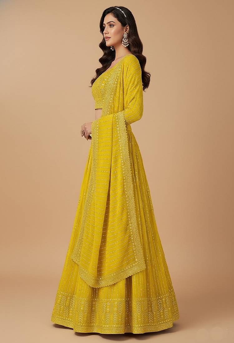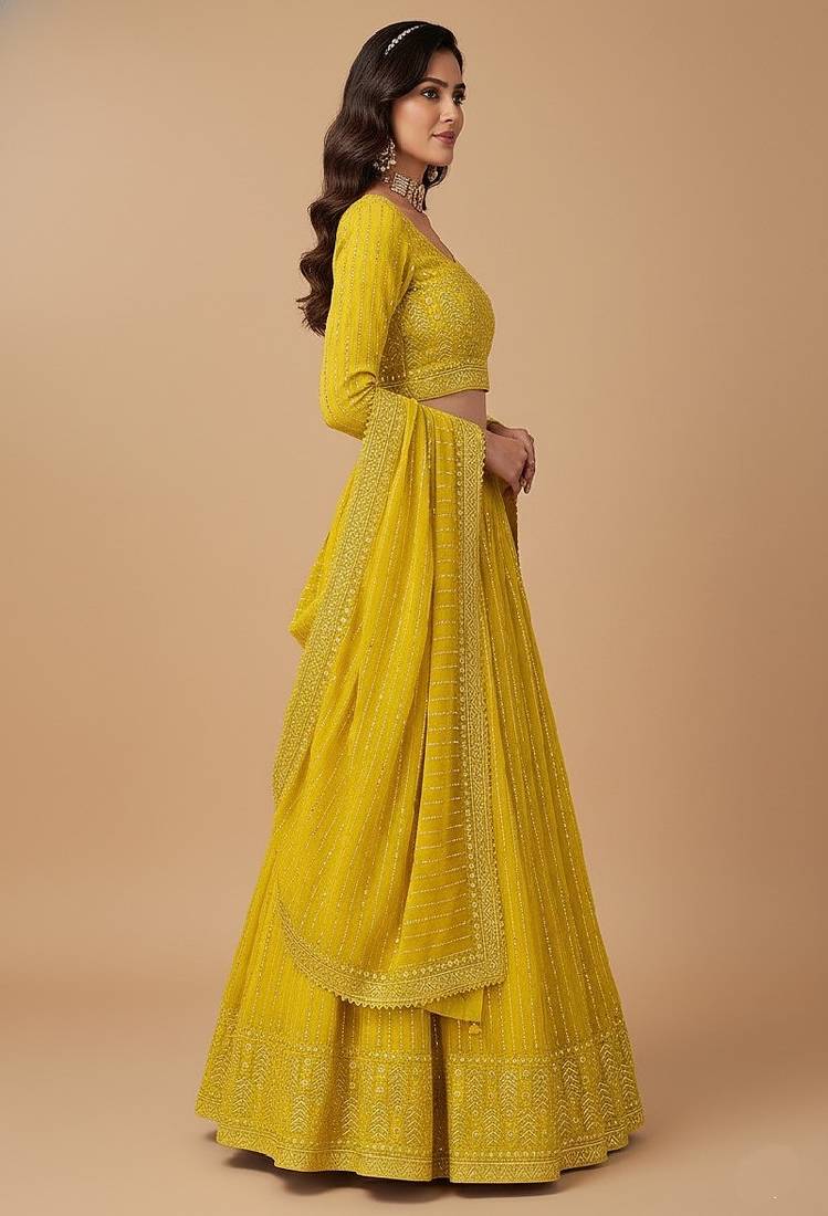 Yellow multi needle , 3mm sequence , coding , embroidery , zari faux georgette lehenga choli with dupatta