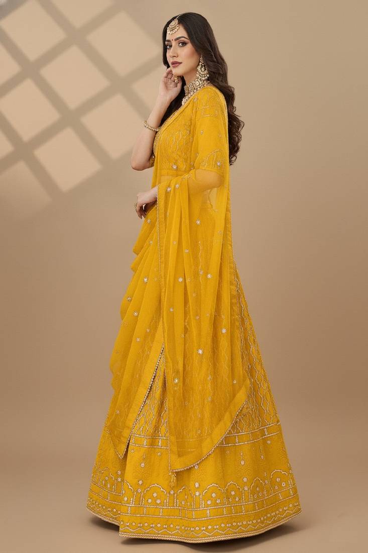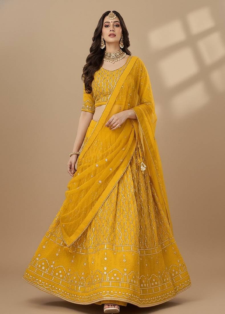 Yellow multi needle , sequence 5mm , coding work, embroidery , zari fox georgette lehenga choli with dupatta