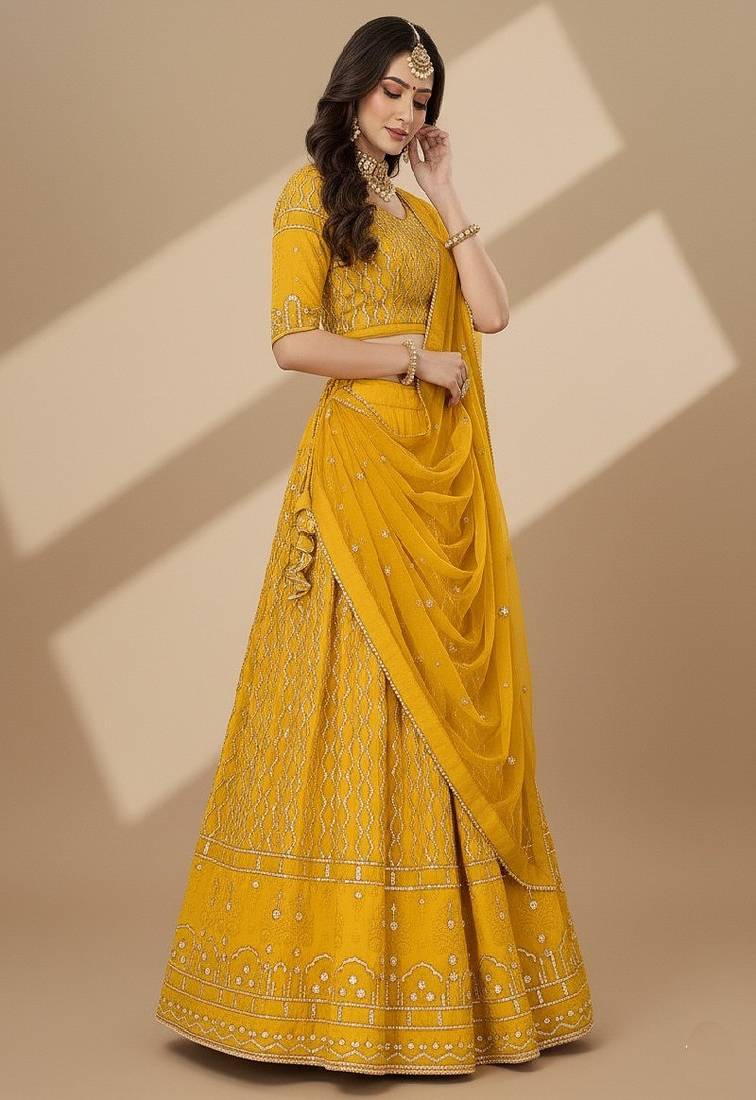 | Product Name | Yellow Multi Needle , Sequence 5mm , Coding Work, Embroidery , Zari Fox Georgette Lehenga Choli With Dupatta | |